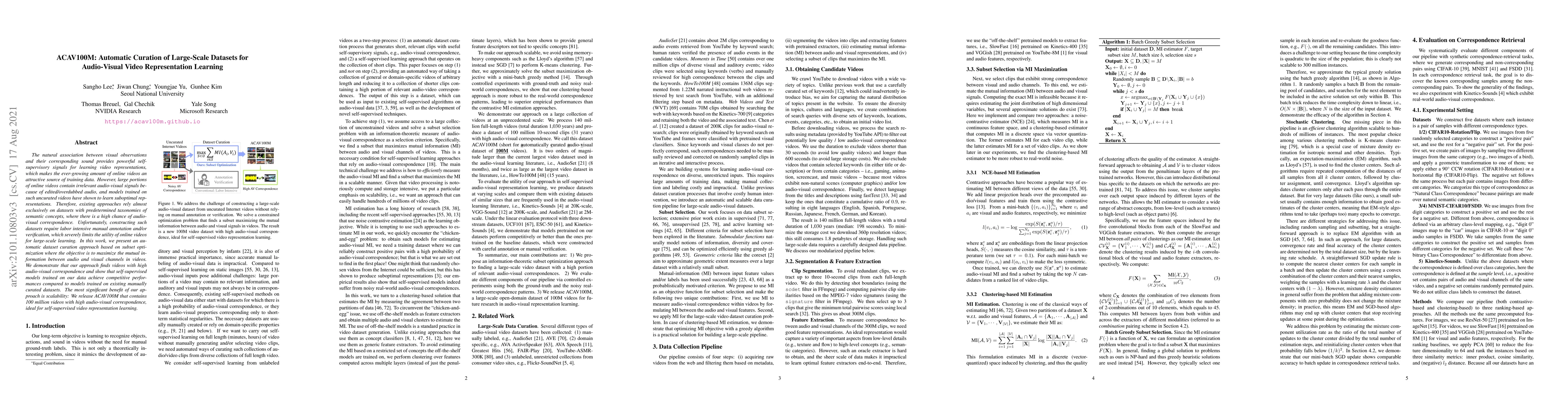 This paper introduces ACAV100M, an automatic curation method for large-scale audio-visual datasets, aiming to maximize mutual information between audio and visual channels. The approach enables scalable, self-supervised video representation learning, releasing a dataset of 100 million curated videos that outperforms models trained on manually curated datasets.