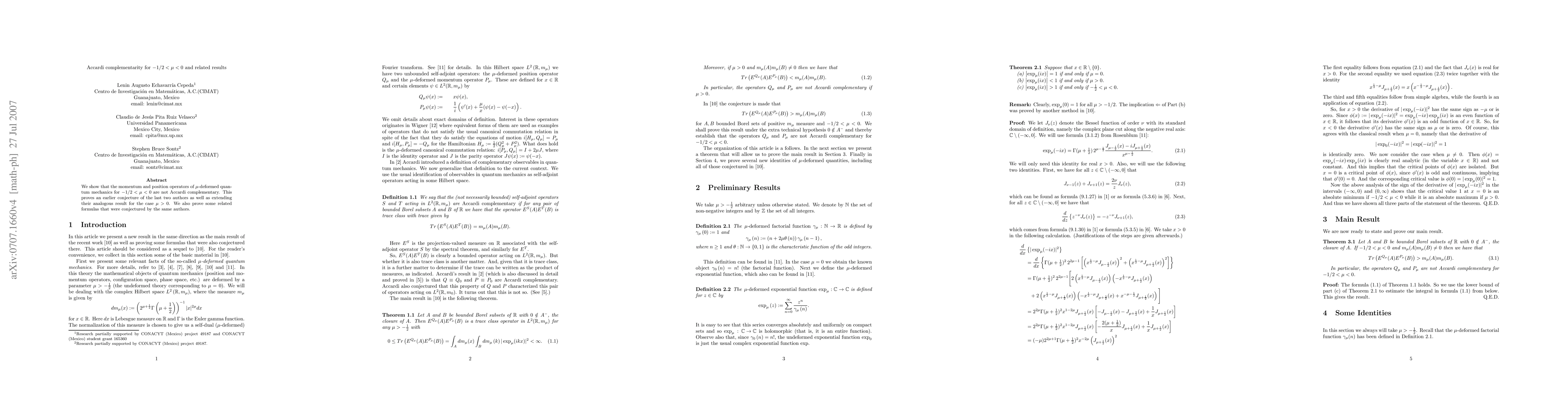 We show (an earlier conjecture of the last two authors) that the momentum and position operators of mu-deformed quantum mechanics for -1/2 < mu < 0 are not Accardi complementary. We also prove some related formulas that were conjectured by the same authors.