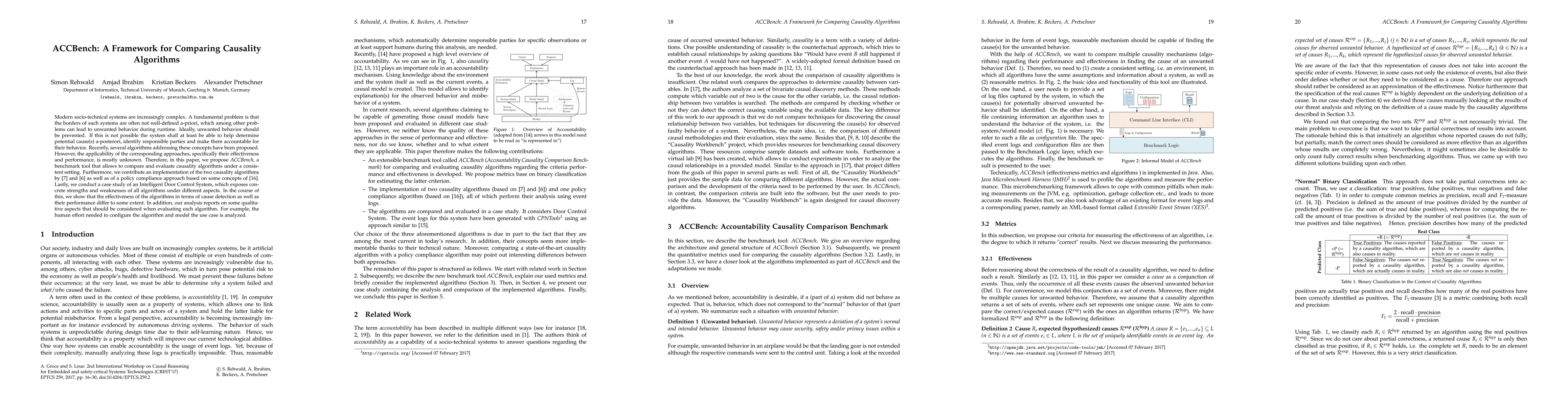 Modern socio-technical systems are increasingly complex. A fundamental problem is that the borders of such systems are often not well-defined a-priori, which among other problems can lead to unwanted behavior during runtime. Ideally, unwanted behavior should be prevented. If this is not possible the system shall at least be able to help determine potential cause(s) a-posterori, identify responsible parties and make them accountable for their behavior. Recently, several algorithms addressing these concepts have been proposed. However, the applicability of the corresponding approaches, specifically their effectiveness and performance, is mostly unknown. Therefore, in this paper, we propose ACCBench, a benchmark tool that allows to compare and evaluate causality algorithms under a consistent setting. Furthermore, we contribute an implementation of the two causality algorithms by G\"o{\ss}ler and Metayer and G\"o{\ss}ler and Astefanoaei as well as of a policy compliance approach based on some concepts of Main et al. Lastly, we conduct a case study of an Intelligent Door Control System, which exposes concrete strengths and weaknesses of all algorithms under different aspects. In the course of this, we show that the effectiveness of the algorithms in terms of cause detection as well as their performance differ to some extent. In addition, our analysis reports on some qualitative aspects that should be considered when evaluating each algorithm. For example, the human effort needed to configure the algorithm and model the use case is analyzed.