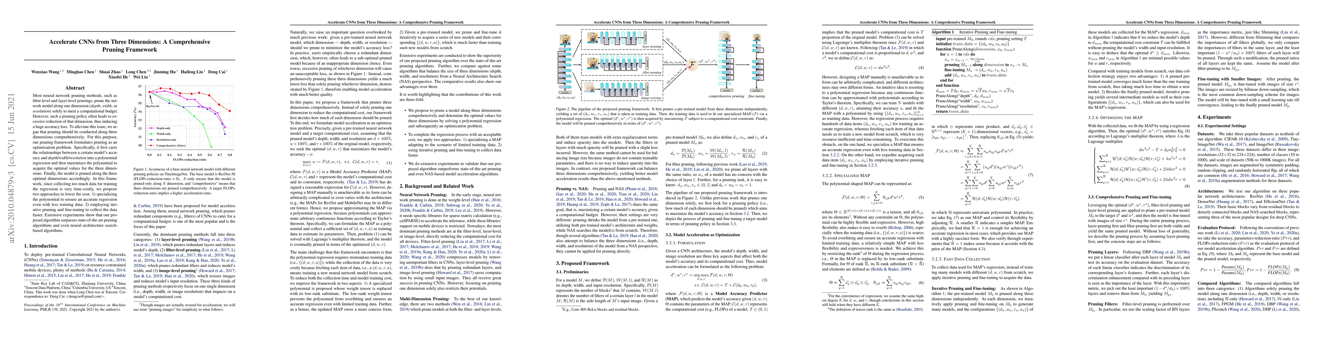 Most neural network pruning methods, such as filter-level and layer-level prunings, prune the network model along one dimension (depth, width, or resolution) solely to meet a computational budget. However, such a pruning policy often leads to excessive reduction of that dimension, thus inducing a huge accuracy loss. To alleviate this issue, we argue that pruning should be conducted along three dimensions comprehensively. For this purpose, our pruning framework formulates pruning as an optimization problem. Specifically, it first casts the relationships between a certain model's accuracy and depth/width/resolution into a polynomial regression and then maximizes the polynomial to acquire the optimal values for the three dimensions. Finally, the model is pruned along the three optimal dimensions accordingly. In this framework, since collecting too much data for training the regression is very time-costly, we propose two approaches to lower the cost: 1) specializing the polynomial to ensure an accurate regression even with less training data; 2) employing iterative pruning and fine-tuning to collect the data faster. Extensive experiments show that our proposed algorithm surpasses state-of-the-art pruning algorithms and even neural architecture search-based algorithms.