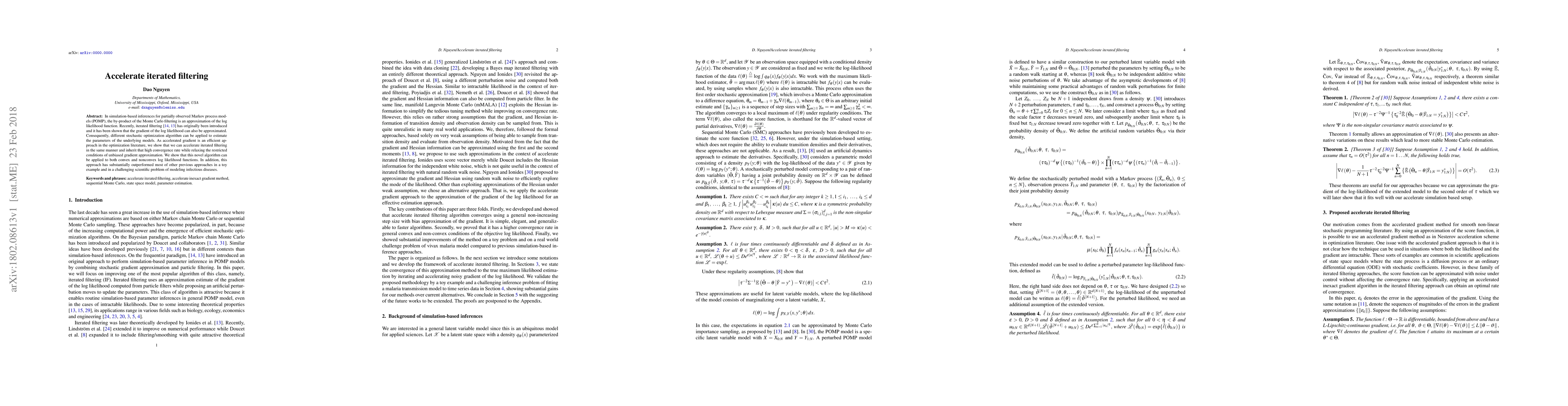 In simulation-based inferences for partially observed Markov process models (POMP), the by-product of the Monte Carlo filtering is an approximation of the log likelihood function. Recently, iterated filtering [14, 13] has originally been introduced and it has been shown that the gradient of the log likelihood can also be approximated. Consequently, different stochastic optimization algorithm can be applied to estimate the parameters of the underlying models. As accelerated gradient is an efficient approach in the optimization literature, we show that we can accelerate iterated filtering in the same manner and inherit that high convergence rate while relaxing the restricted conditions of unbiased gradient approximation. We show that this novel algorithm can be applied to both convex and non-convex log likelihood functions. In addition, this approach has substantially outperformed most of other previous approaches in a toy example and in a challenging scientific problem of modeling infectious diseases.