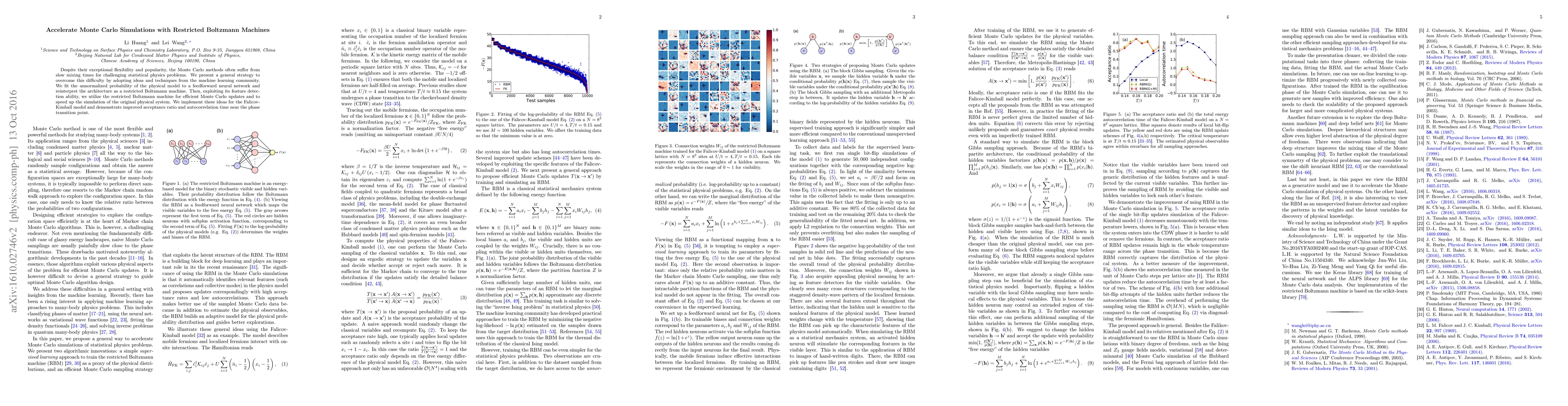 This paper proposes using restricted Boltzmann machines (RBMs) to accelerate Monte Carlo simulations by fitting a neural network to the unnormalized probability of a physical model, thereby improving mixing times and speeding up simulations, as demonstrated in the Falicov-Kimball model. The approach shows enhanced acceptance ratios and reduced autocorrelation times near phase transitions.