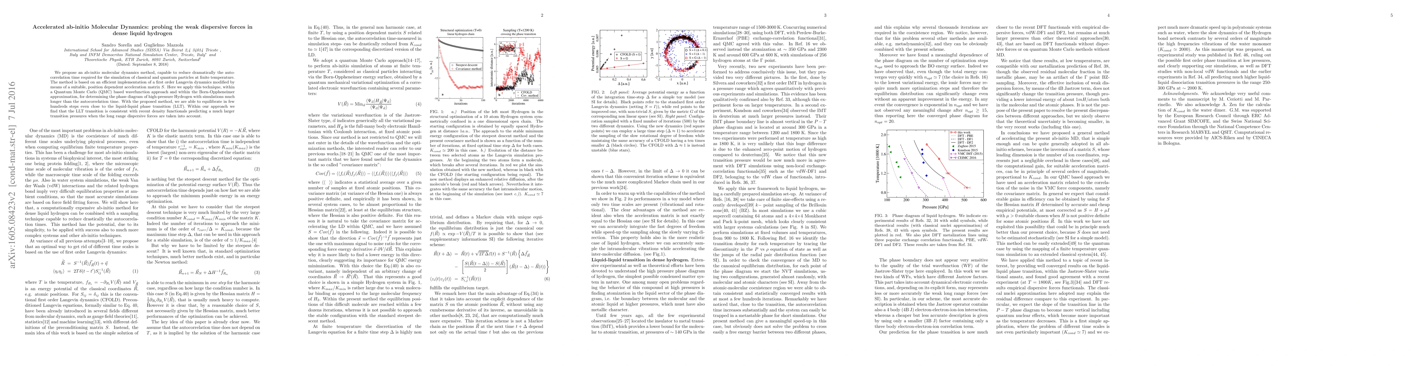 We propose an ab-initio molecular dynamics method, capable to reduce dramatically the autocorrelation time required for the simulation of classical and quantum particles at finite temperature. The method is based on an efficient implementation of a first order Langevin dynamics modified by means of a suitable, position dependent acceleration matrix $S$. Here we apply this technique, within a Quantum Monte Carlo (QMC) based wavefuntion approach and within the Born-Oppheneimer approximation, for determining the phase diagram of high-pressure Hydrogen with simulations much longer than the autocorrelation time. With the proposed method, we are able to equilibrate in few hundreds steps even close to the liquid-liquid phase transition (LLT). Within our approach we find that the LLT transition is consistent with recent density functionals predicting a much larger transition pressures when the long range dispersive forces are taken into account.