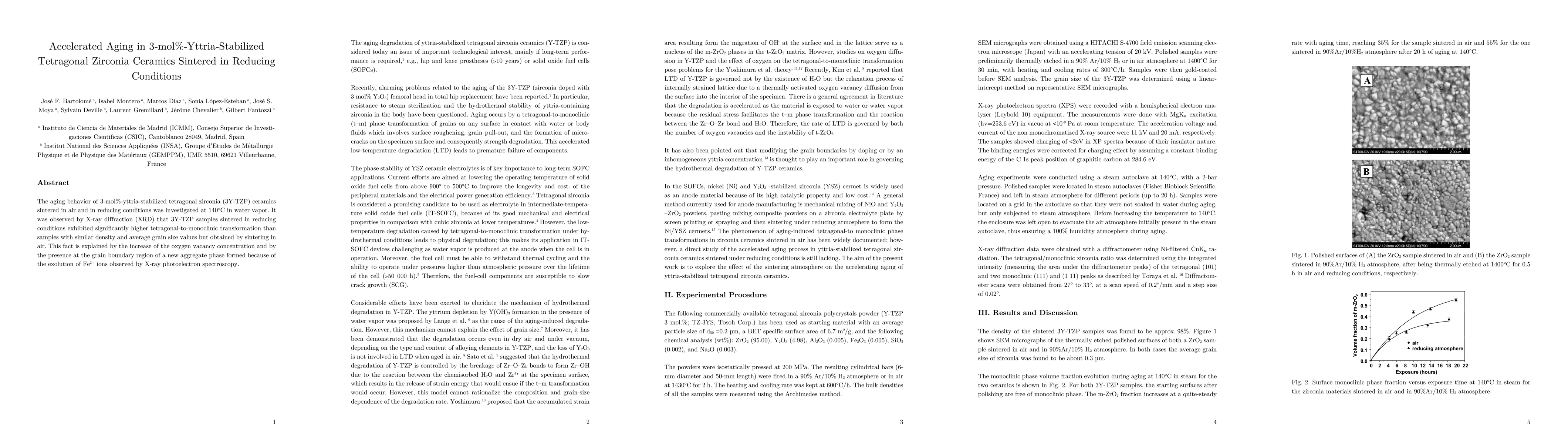 This study investigates the accelerated aging of 3-mol%-yttria-stabilized tetragonal zirconia (3Y-TZP) ceramics sintered under reducing conditions, finding significantly higher tetragonal-to-monoclinic phase transformation compared to air-sintered samples, attributed to increased oxygen vacancy concentration and the presence of a new Fe2+ ion aggregate phase at grain boundaries.