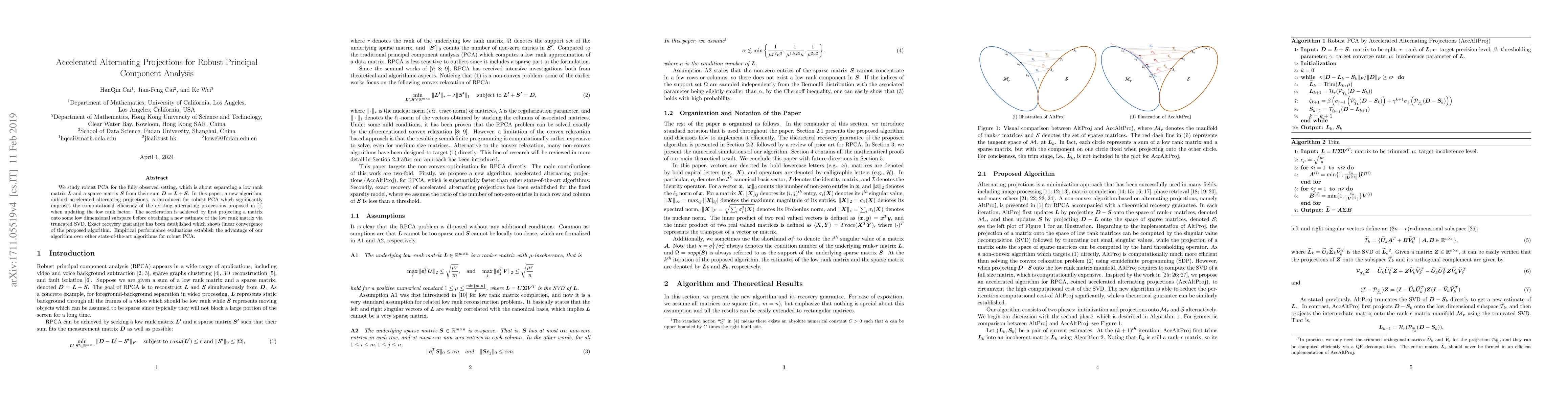 This paper introduces an accelerated alternating projections algorithm for robust PCA, improving computational efficiency over existing methods by projecting matrices onto low-dimensional subspaces before updating the low-rank factor. The algorithm demonstrates linear convergence and outperforms other state-of-the-art methods in empirical evaluations.