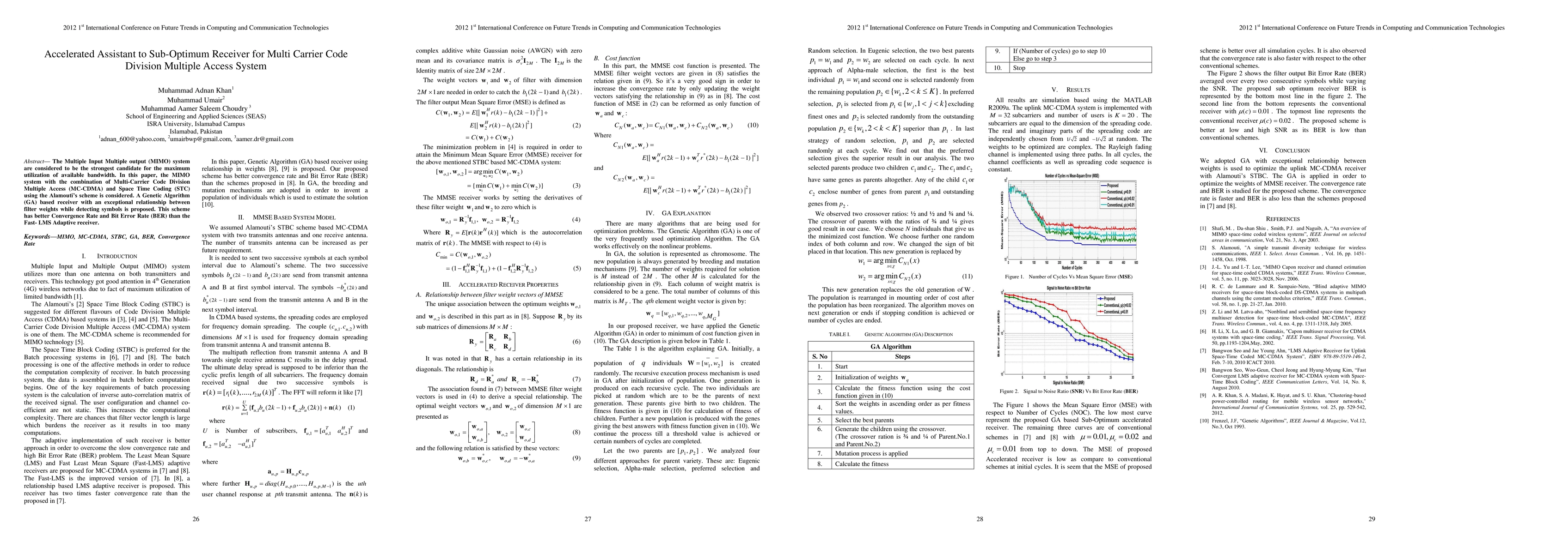 The Multiple Input Multiple output system are considered to be the strongest candidate for the maximum utilization of available bandwidth. In this paper, the MIMO system with the combination of Multi-Carrier Code Division Multiple Access and Space Time Coding using the Alamoutis scheme is considered. A Genetic Algorithm based receiver with an exceptional relationship between filter weights while detecting symbols is proposed. This scheme has better Convergence Rate and Bit Error Rate than the Fast-LMS Adaptive receiver.