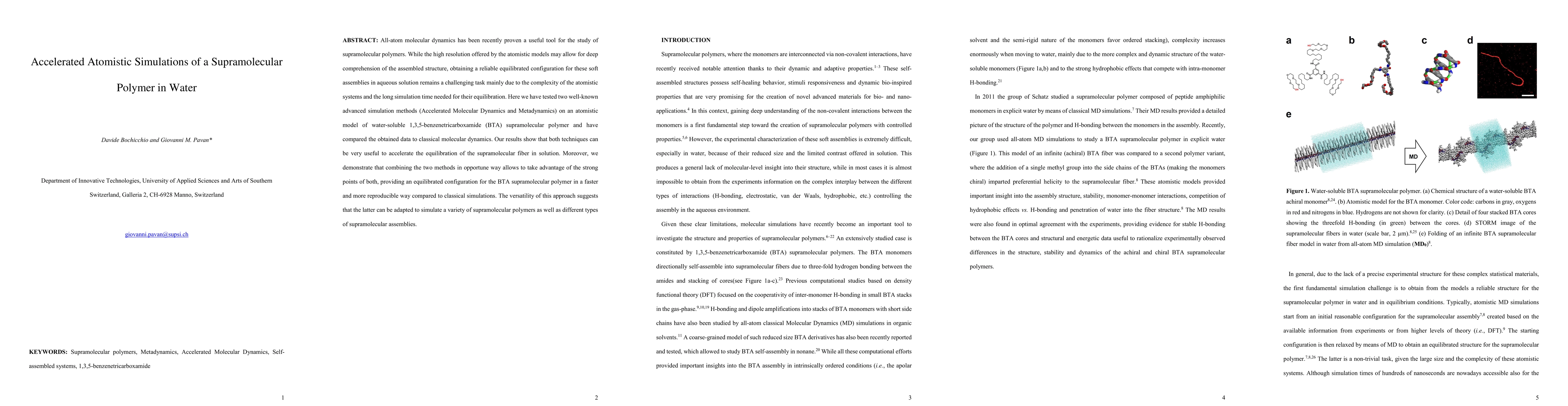 All-atom molecular dynamics has been recently proven a useful tool for the study of supramolecular polymers. While the high resolution offered by the atomistic models may allow for deep comprehension of the assembled structure, obtaining a reliable equilibrated configuration for these soft assemblies in aqueous solution remains a challenging task mainly due to the complexity of the atomistic systems and the long simulation time needed for their equilibration. Here we have tested two well-known advanced simulation methods (Accelerated Molecular Dynamics and Metadynamics) on an atomistic model of water-soluble 1,3,5-benzenetricarboxamide (BTA) supramolecular polymer and have compared the obtained data to classical molecular dynamics. Our results show that both techniques can be very useful to accelerate the equilibration of the supramolecular fiber in solution. Moreover, we demonstrate that combining the two methods in opportune way allows to take advantage of the strong points of both, providing an equilibrated configuration for the BTA supramolecular polymer in a faster and more reproducible way compared to classical simulations. The versatility of this approach suggests that the latter can be adapted to simulate a variety of supramolecular polymers as well as different types of supramolecular assemblies.