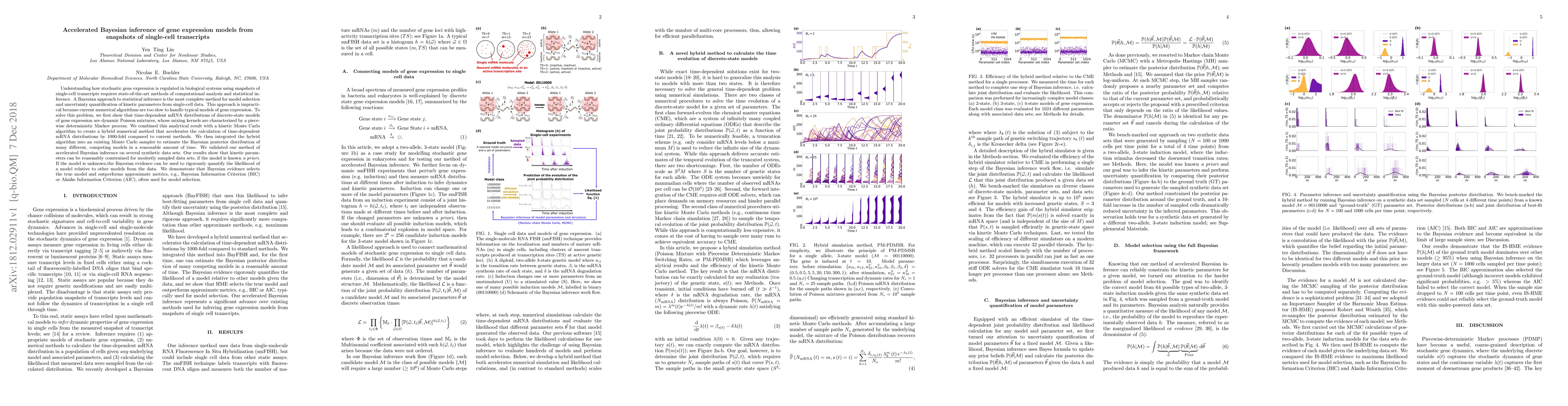 This paper presents a hybrid numerical method combining analytical results and kinetic Monte Carlo to accelerate Bayesian inference for gene expression models from single-cell transcript data, achieving a 1000-fold speedup over existing methods. The method effectively estimates Bayesian posterior distributions and selects the true model based on Bayesian evidence, outperforming traditional metrics like BIC or AIC.