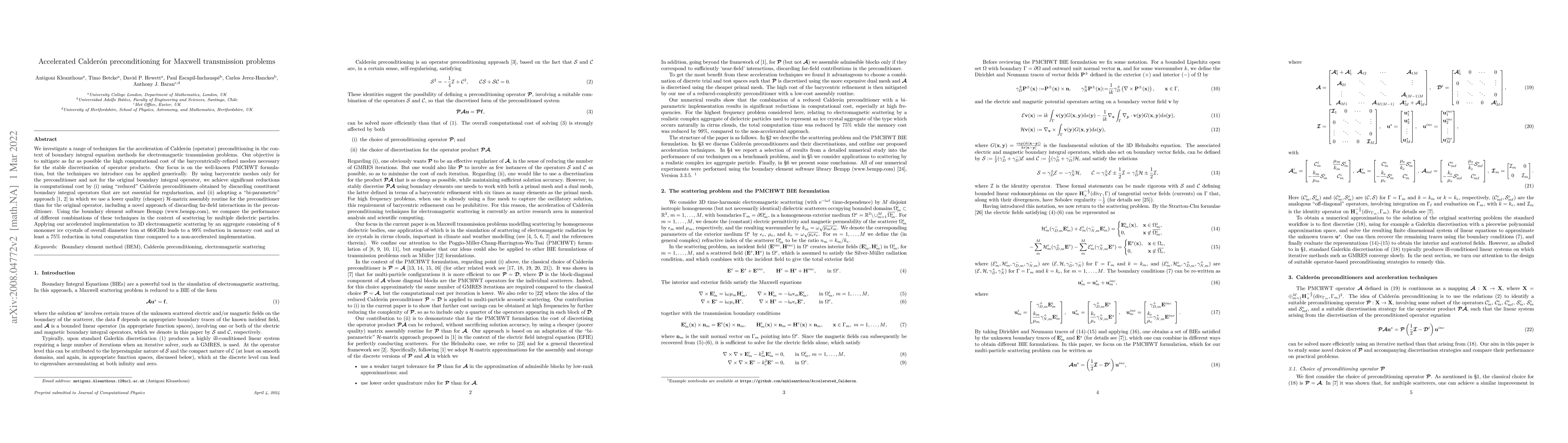 This paper explores accelerated Calder\'on preconditioning techniques to reduce computational costs for electromagnetic transmission problems using boundary integral equation methods. The proposed methods achieve significant reductions by employing reduced preconditioners and a bi-parametric approach, leading to a 99% memory cost reduction and at least a 75% reduction in total computation time for scattering simulations.