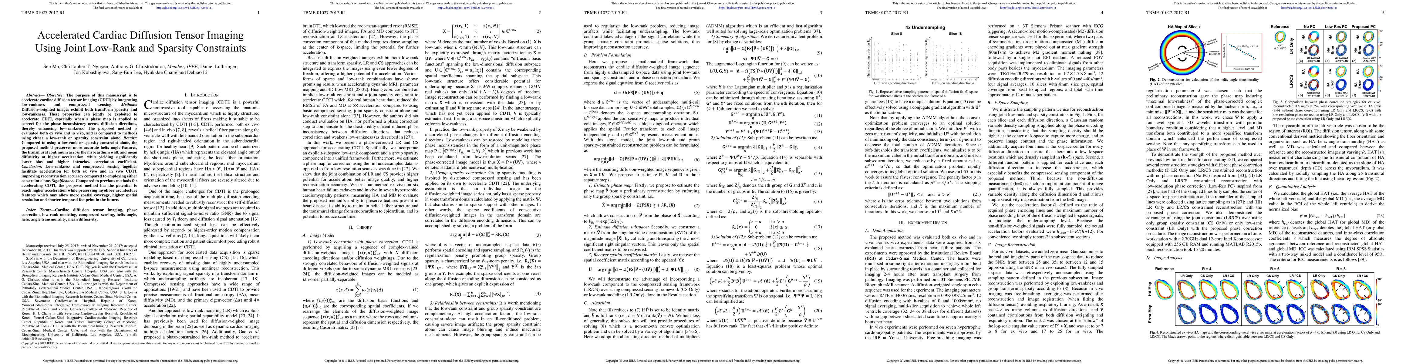 This paper proposes an accelerated cardiac diffusion tensor imaging method using joint low-rank and sparsity constraints, achieving higher acceleration rates while preserving myofiber architecture features compared to methods using either constraint alone. The method shows improved reconstruction accuracy, lower bias, and higher intraclass correlation coefficient in both ex vivo and in vivo evaluations.