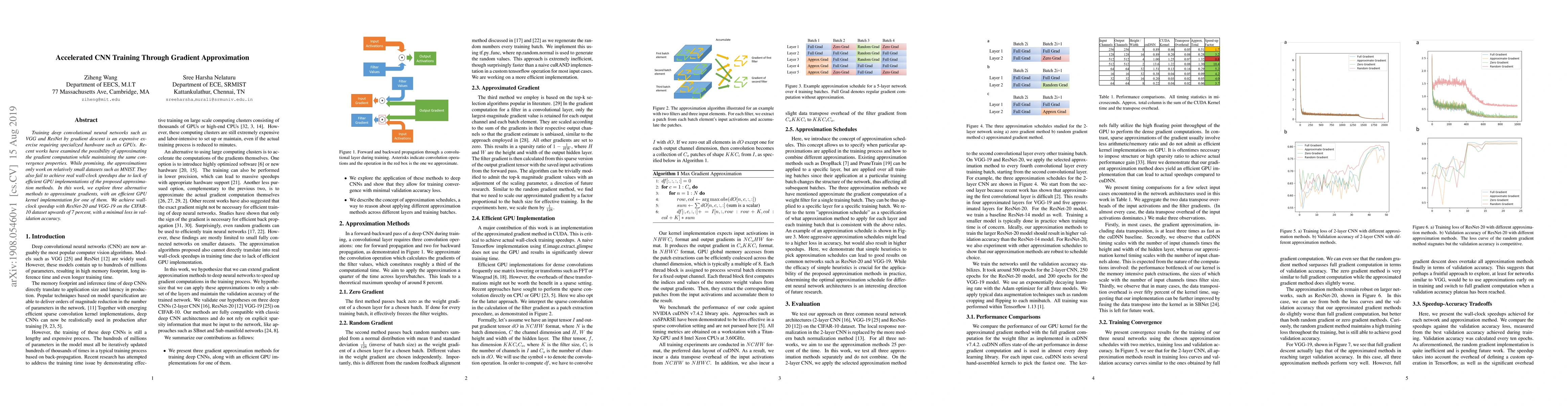 Training deep convolutional neural networks such as VGG and ResNet by gradient descent is an expensive exercise requiring specialized hardware such as GPUs. Recent works have examined the possibility of approximating the gradient computation while maintaining the same convergence properties. While promising, the approximations only work on relatively small datasets such as MNIST. They also fail to achieve real wall-clock speedups due to lack of efficient GPU implementations of the proposed approximation methods. In this work, we explore three alternative methods to approximate gradients, with an efficient GPU kernel implementation for one of them. We achieve wall-clock speedup with ResNet-20 and VGG-19 on the CIFAR-10 dataset upwards of 7%, with a minimal loss in validation accuracy.
