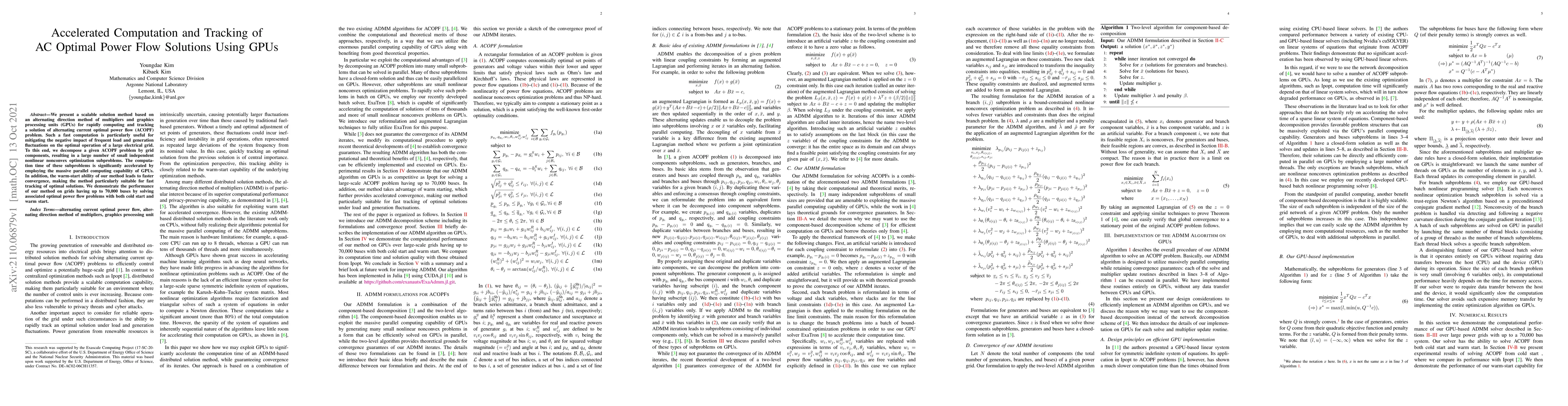 This paper proposes a scalable GPU-based solution method using an alternating direction method of multipliers for fast computation and tracking of AC optimal power flow solutions, significantly reducing computation time and enabling rapid response to grid fluctuations. The method decomposes the problem into smaller subproblems, leveraging GPU parallel computing for efficiency.