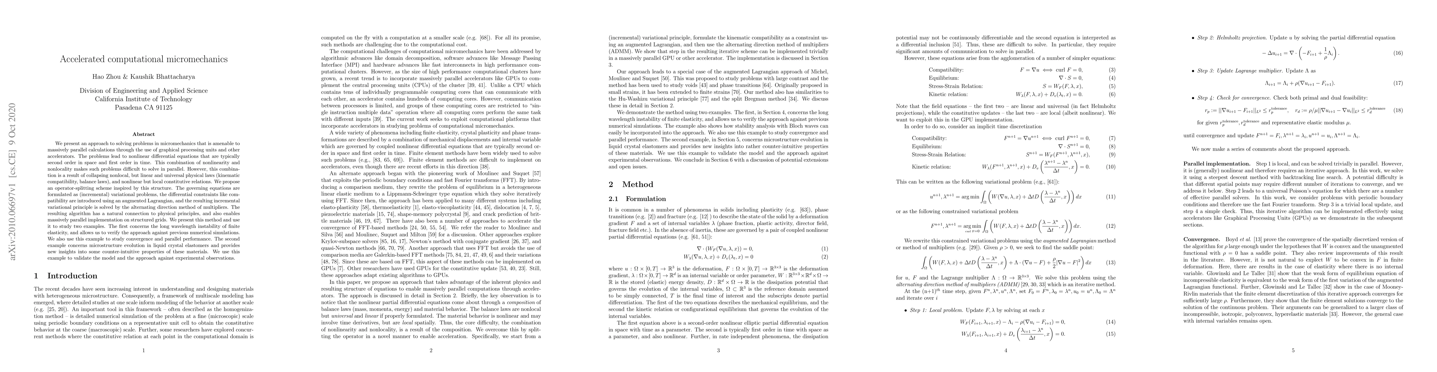 We present an approach to solving problems in micromechanics that is amenable to massively parallel calculations through the use of graphical processing units and other accelerators. The problems lead to nonlinear differential equations that are typically second order in space and first order in time. This combination of nonlinearity and nonlocality makes such problems difficult to solve in parallel. However, this combination is a result of collapsing nonlocal, but linear and universal physical laws (kinematic compatibility, balance laws), and nonlinear but local constitutive relations. We propose an operator-splitting scheme inspired by this structure. The governing equations are formulated as (incremental) variational problems, the differential constraints like compatibility are introduced using an augmented Lagrangian, and the resulting incremental variational principle is solved by the alternating direction method of multipliers. The resulting algorithm has a natural connection to physical principles, and also enables massively parallel implementation on structured grids. We present this method and use it to study two examples. The first concerns the long wavelength instability of finite elasticity, and allows us to verify the approach against previous numerical simulations. We also use this example to study convergence and parallel performance. The second example concerns microstructure evolution in liquid crystal elastomers and provides new insights into some counter-intuitive properties of these materials. We use this example to validate the model and the approach against experimental observations.