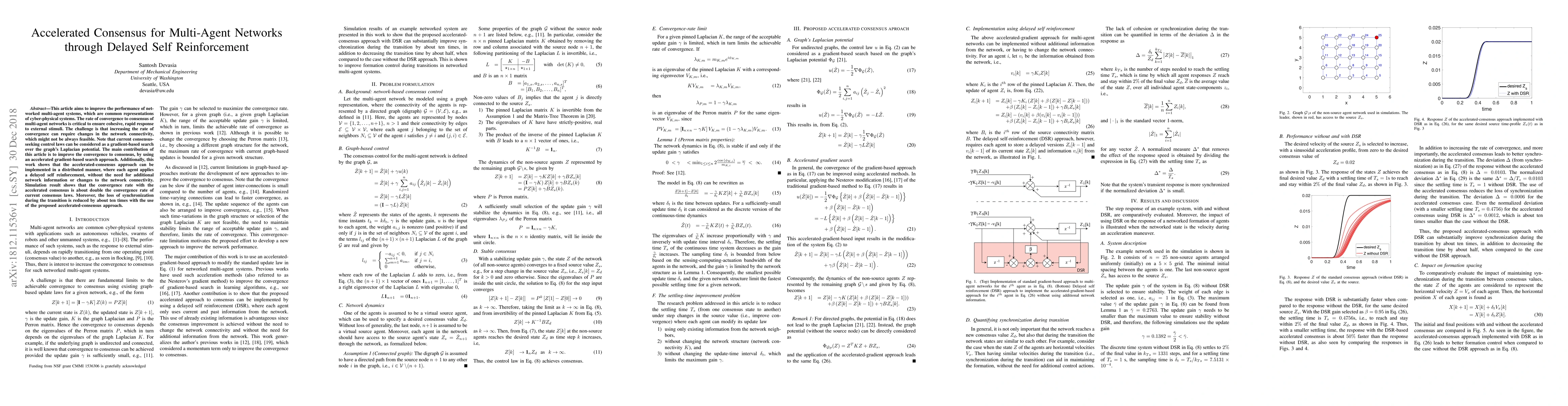 This article aims to improve the performance of networked multi-agent systems, which are common representations of cyber-physical systems. The rate of convergence to consensus of multi-agent networks is critical to ensure cohesive, rapid response to external stimuli. The challenge is that increasing the rate of convergence can require changes in the network connectivity, which might not be always feasible. Note that current consensus-seeking control laws can be considered as a gradient-based search over the graph's Laplacian potential. The main contribution of this article is to improve the convergence to consensus, by using an accelerated gradient-based search approach. Additionally, this work shows that the accelerated-consensus approach can be implemented in a distributed manner, where each agent applies a delayed self reinforcement, without the need for additional network information or changes to the network connectivity. Simulation results of an example networked system are presented in this work to show that the proposed accelerated-consensus approach with DSR can substantially improve synchronization during the transition by about ten times, in addition to decreasing the transition time by about half, when compared to the case without the DSR approach. This is shown to improve formation control during transitions in networked multi-agent systems.