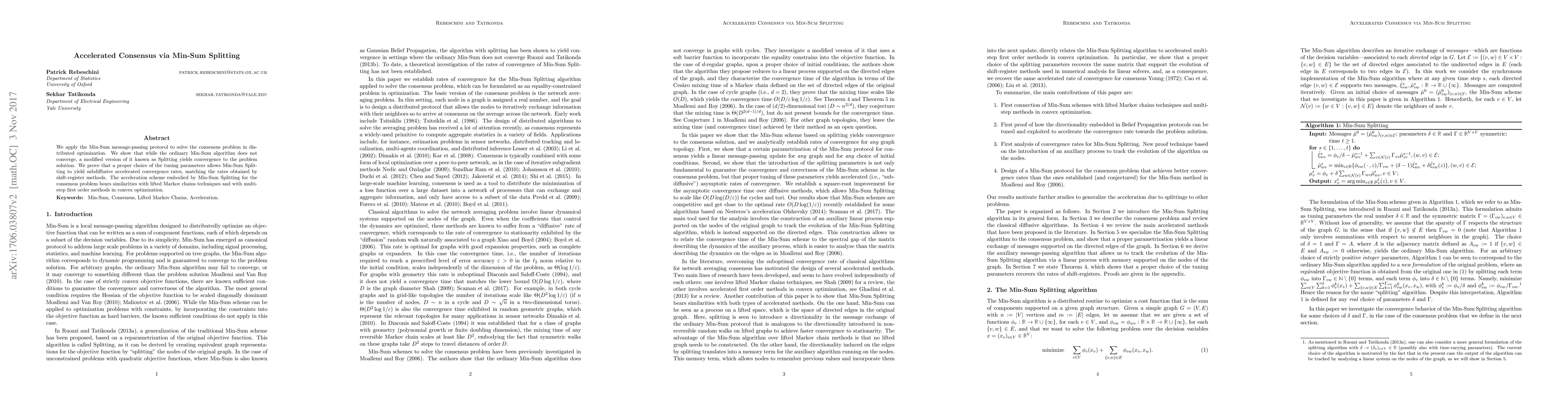 This paper proposes a modified Min-Sum Splitting protocol to solve consensus problems in distributed optimization, demonstrating its convergence to the solution and accelerated convergence rates comparable to shift-register methods, achieved through appropriate tuning of parameters. The method shares similarities with lifted Markov chains and multi-step first-order optimization techniques.