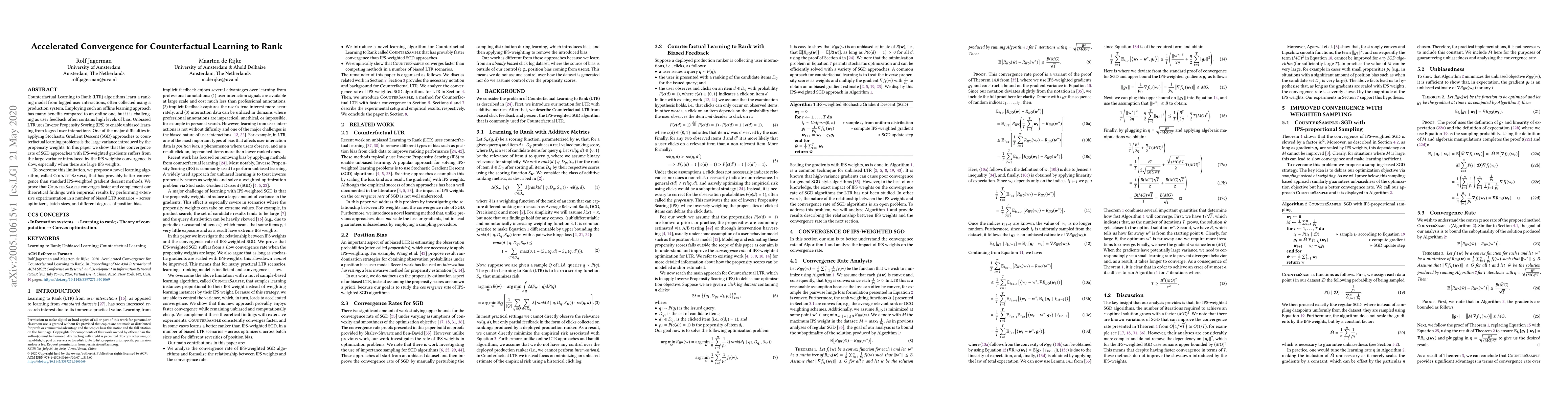 This paper proposes a novel algorithm called CounterSample to accelerate convergence for Counterfactual Learning to Rank (LTR) using Inverse Propensity Scoring (IPS). It addresses the slow convergence of standard IPS-weighted gradient descent methods due to high variance in IPS weights, demonstrating faster convergence through theoretical proofs and empirical experiments across various scenarios.