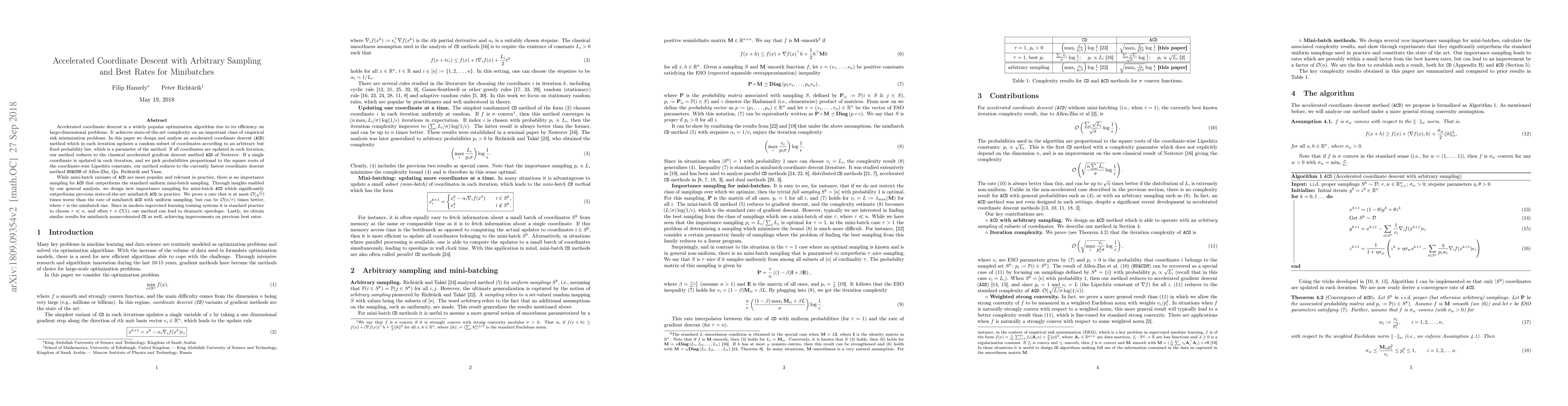 This paper proposes an accelerated coordinate descent method that updates a random subset of coordinates according to an arbitrary sampling probability, achieving state-of-the-art complexity for empirical risk minimization. It introduces a new importance sampling technique for minibatch ACD that outperforms previous methods, potentially leading to significant speedups in modern supervised learning training systems.