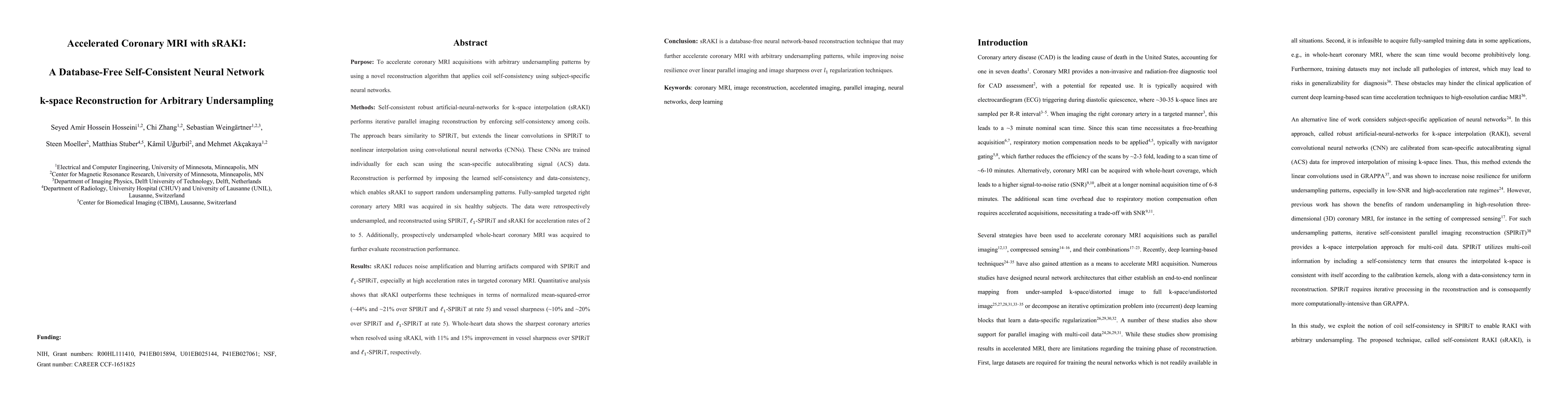 This study aims to accelerate coronary MRI using a novel reconstruction algorithm, called self-consistent robust artificial-neural-networks for k-space interpolation (sRAKI). sRAKI performs iterative parallel imaging reconstruction by enforcing coil self-consistency using subject-specific neural networks. This approach extends the linear convolutions in SPIRiT to nonlinear interpolation using convolutional neural networks (CNNs). These CNNs are trained individually for each scan using the scan-specific autocalibrating signal (ACS) data. Reconstruction is performed by imposing the learned self-consistency and data-consistency enabling sRAKI to support random undersampling patterns. Fully-sampled targeted right coronary artery MRI was acquired in six healthy subjects for evaluation. The data were retrospectively undersampled, and reconstructed using SPIRiT, $\ell_1$-SPIRiT and sRAKI for acceleration rates of 2 to 5. Additionally, prospectively undersampled whole-heart coronary MRI was acquired to further evaluate performance. The results indicate that sRAKI reduces noise amplification and blurring artifacts compared with SPIRiT and $\ell_1$-SPIRiT, especially at high acceleration rates in targeted data. Quantitative analysis shows that sRAKI improves normalized mean-squared-error (~44% and ~21% over SPIRiT and $\ell_1$-SPIRiT at rate 5) and vessel sharpness (~10% and ~20% over SPIRiT and $\ell_1$-SPIRiT at rate 5). In addition, whole-heart data shows the sharpest coronary arteries when resolved using sRAKI, with 11% and 15% improvement in vessel sharpness over SPIRiT and $\ell_1$-SPIRiT, respectively. Thus, sRAKI is a database-free neural network-based reconstruction technique that may further accelerate coronary MRI with arbitrary undersampling patterns, while improving noise resilience over linear parallel imaging and image sharpness over $\ell_1$ regularization techniques.