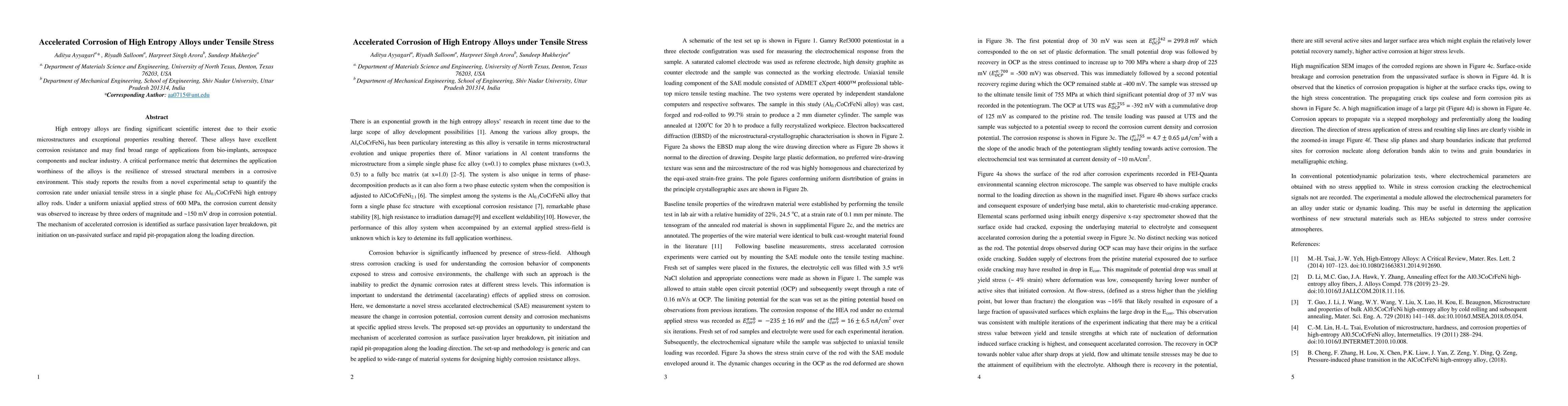 This study investigates the accelerated corrosion of Al0.1CoCrFeNi high entropy alloy under tensile stress, revealing a significant increase in corrosion current density and potential drop due to the breakdown of surface passivation layers and pit propagation. The findings highlight the critical impact of mechanical stress on the corrosion resistance of these alloys.