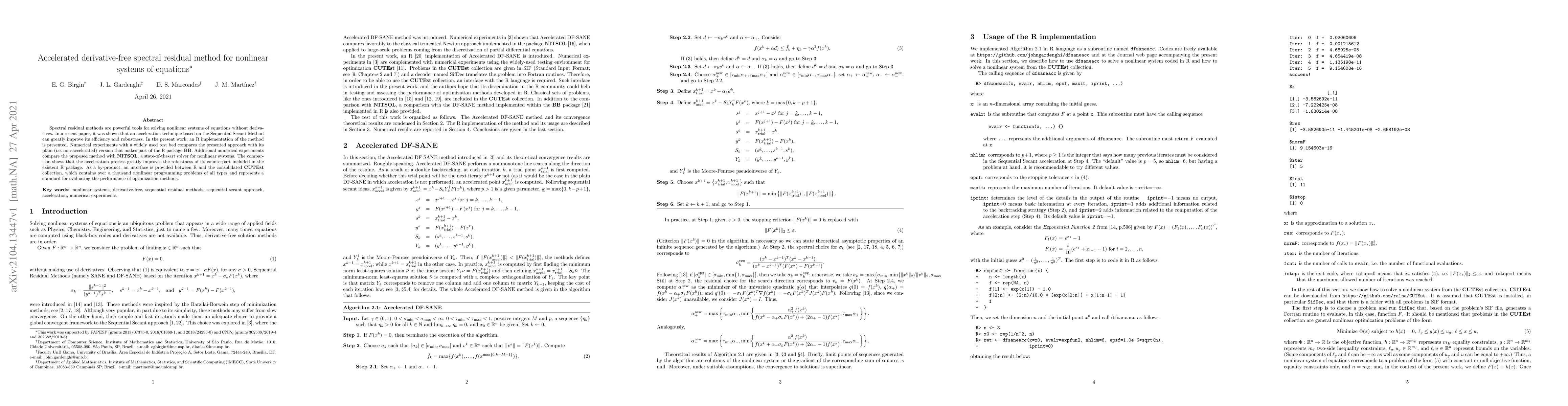 A new method for solving nonlinear systems of equations without derivatives is presented, which significantly improves efficiency and robustness compared to a non-accelerated version, and provides an interface with the CUTEst collection of nonlinear programming problems.