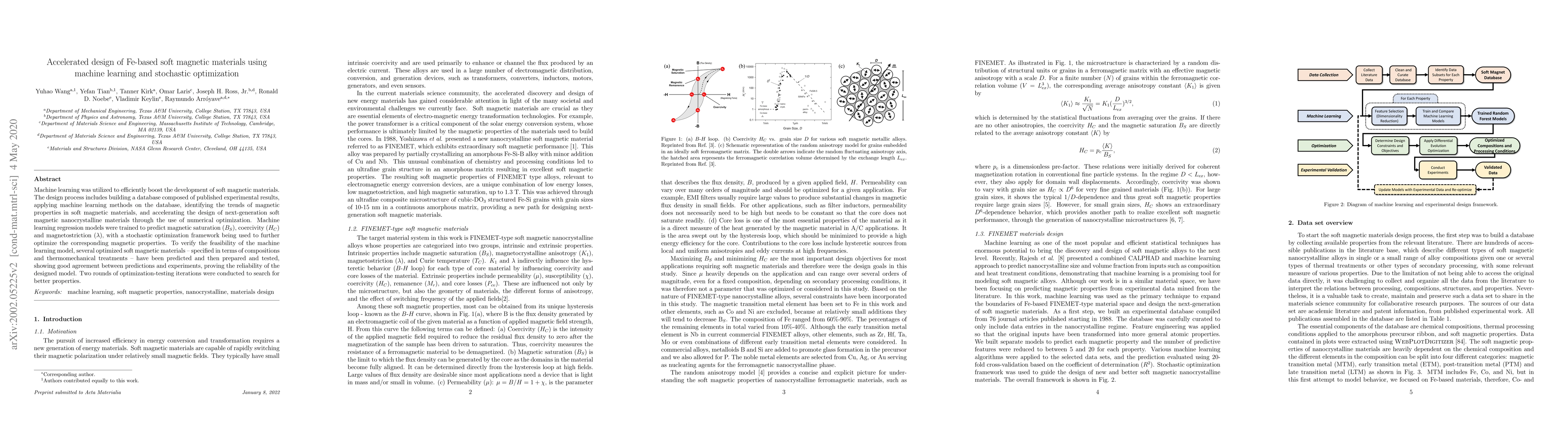 This paper employs machine learning to expedite the design of Fe-based soft magnetic materials, predicting key properties like magnetic saturation, coercivity, and magnetostriction. A stochastic optimization framework further refines these properties, validated through iterative optimization-testing cycles that demonstrate high accuracy between predicted and experimental results.