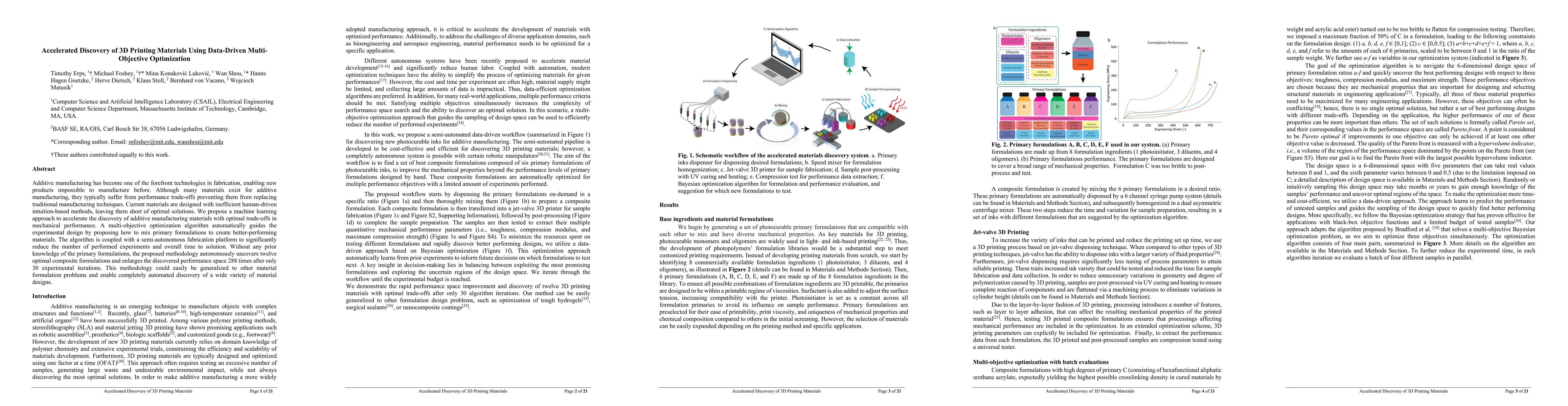 This paper proposes a machine learning-driven multi-objective optimization approach to accelerate the discovery of optimal 3D printing materials, significantly reducing the number of experiments needed. The method autonomously identifies twelve superior composite formulations, expanding the performance space by 288 times in just 30 iterations.