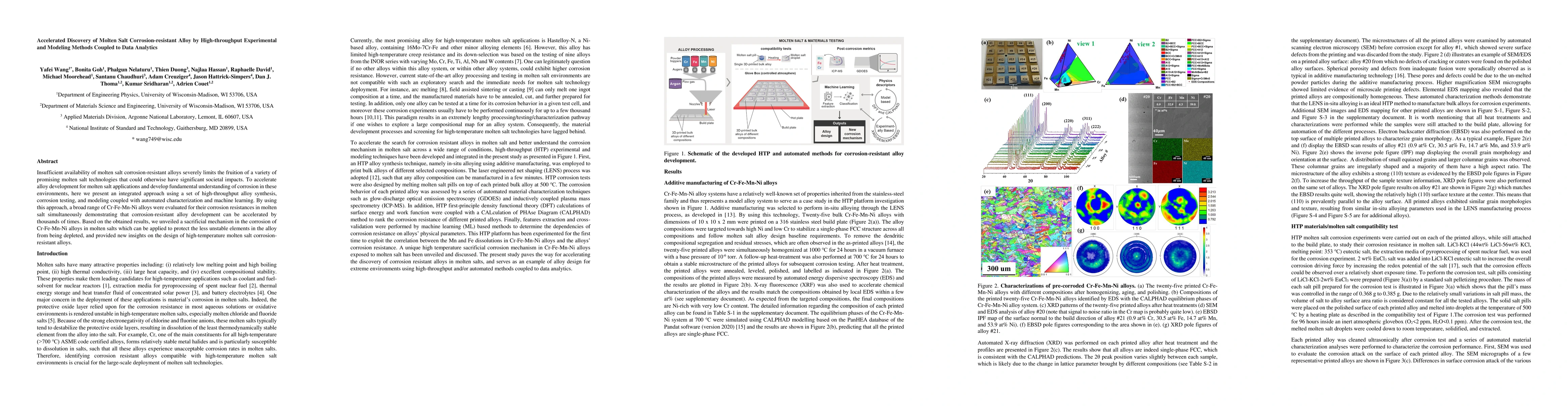 This research utilizes high-throughput methods and data analytics to accelerate the discovery of corrosion-resistant Cr-Fe-Mn-Ni alloys for molten salt applications, demonstrating a significant speedup in alloy development and unveiling a sacrificial mechanism for enhanced corrosion resistance.