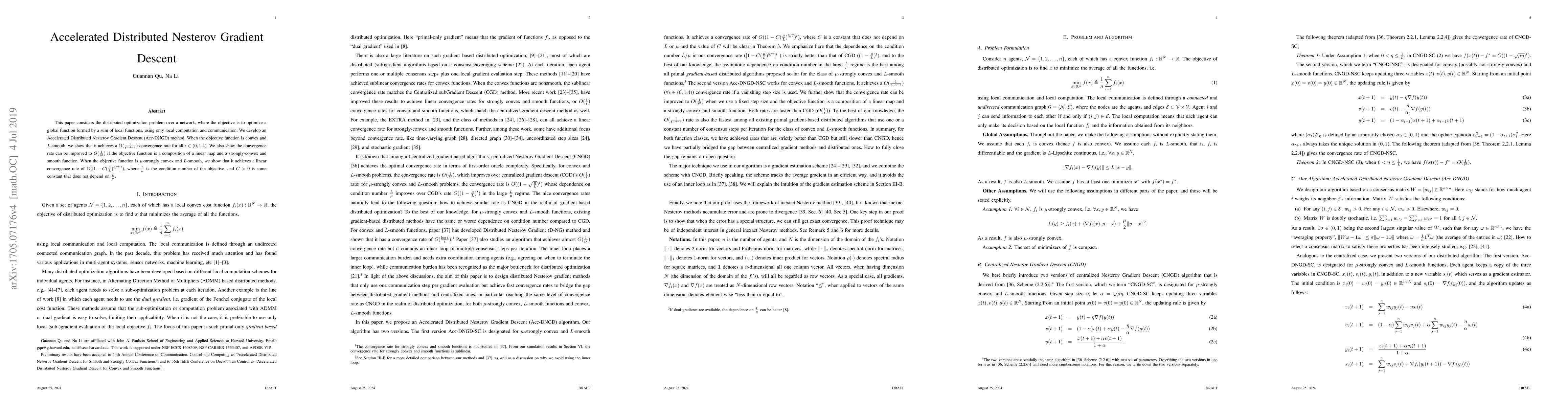 This paper introduces an Accelerated Distributed Nesterov Gradient Descent (Acc-DNGD) method for optimizing global functions formed by a sum of local functions over a network. It achieves a convergence rate of $O(\frac{1}{t^{1.4-\epsilon}})$ for convex and $L$-smooth functions, and $O(\frac{1}{t^2})$ for strongly convex and smooth compositions. For $\mu$-strongly convex and $L$-smooth functions, it demonstrates linear convergence with rate $O([ 1 - C (\frac{\mu}{L})^{5/7} ]^t)$.
