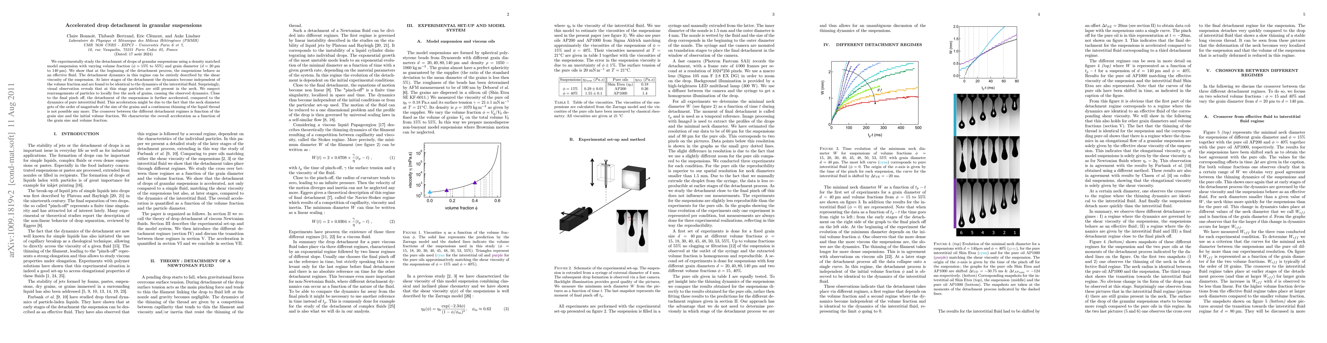 This study experimentally investigates the detachment dynamics of granular suspension drops, revealing that initial detachment behavior is fluid-like and governed by shear viscosity, while later stages show particle rearrangements facilitating neck release and an accelerated final pinch-off due to grain size effects. The transition between regimes depends on grain size and initial volume fraction.
