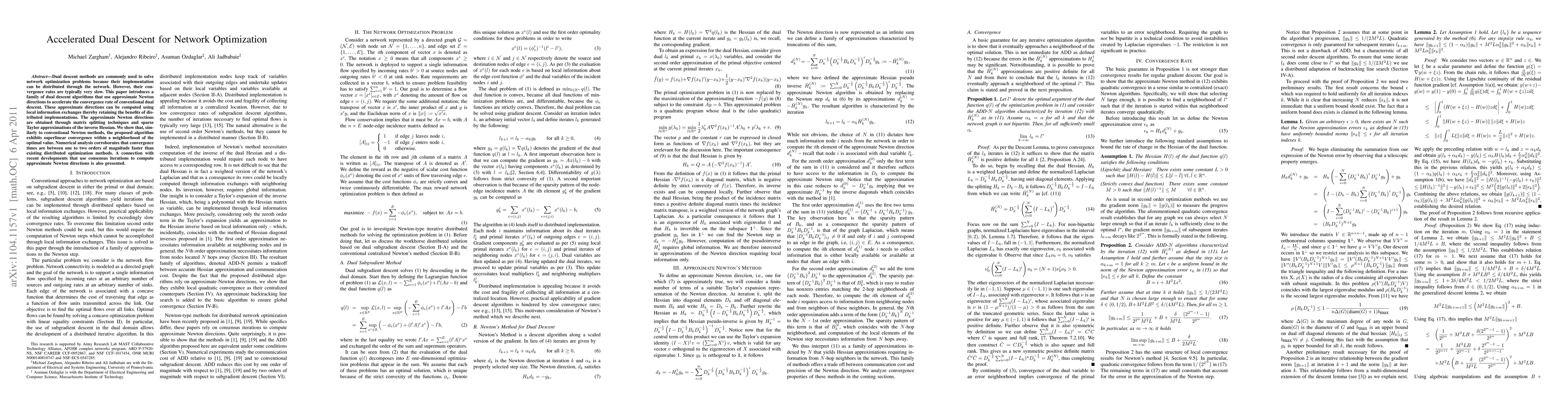 A new method for accelerating dual descent in network optimization problems is introduced, using approximate Newton directions to improve convergence rates, which are shown to be between one to two orders of magnitude faster than existing methods.