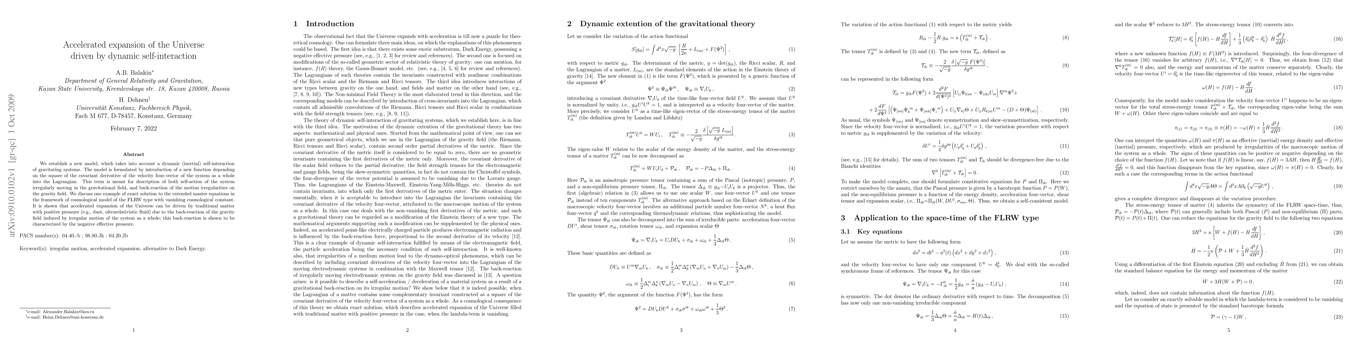 We establish a new model, which takes into account a dynamic (inertial) self-interaction of gravitating systems. The model is formulated by introduction of a new function depending on the square of the covariant derivative of the velocity four-vector of the system as a whole into the Lagrangian. This term is meant for description of both self-action of the system irregularly moving in the gravitational field, and back-reaction of the motion irregularities on the gravity field. We discuss one example of exact solution to the extended master equations in the framework of cosmological model of the FLRW type with vanishing cosmological constant. It is shown that accelerated expansion of the Universe can be driven by traditional matter with positive pressure (e.g., dust, ultrarelativistic fluid) due to the back-reaction of the gravity field induced by irregular motion of the system as a whole; this back-reaction is shown to be characterized by the negative effective pressure.
