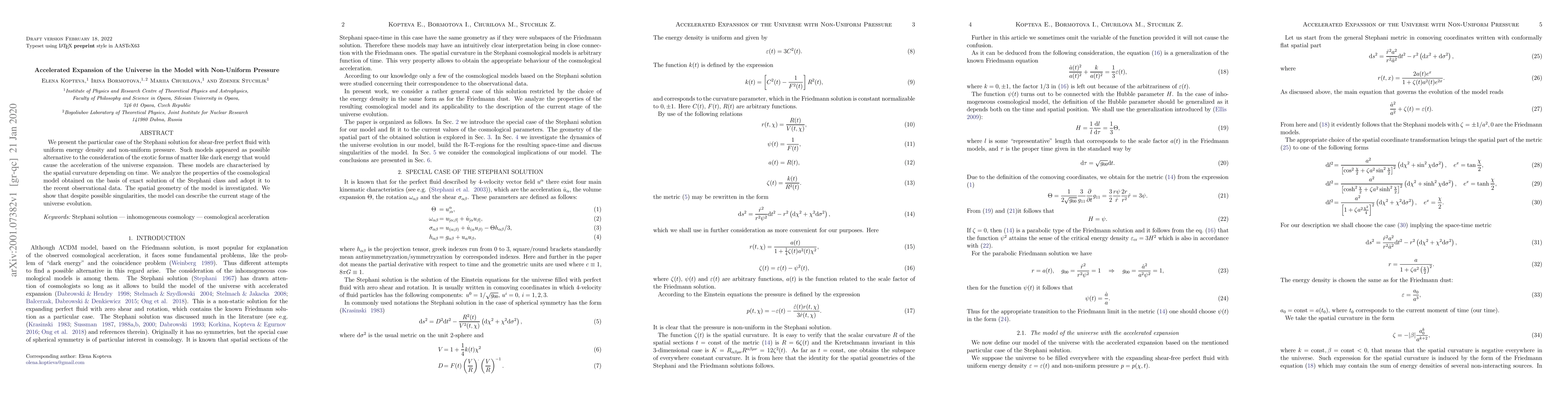 We present the particular case of the Stephani solution for shear-free perfect fluid with uniform energy density and non-uniform pressure. Such models appeared as possible alternative to the consideration of the exotic forms of matter like dark energy that would cause the acceleration of the universe expansion. These models are characterised by the spatial curvature depending on time. We analyze the properties of the cosmological model obtained on the basis of exact solution of the Stephani class and adopt it to the recent observational data. The spatial geometry of the model is investigated. We show that despite possible singularities, the model can describe the current stage of the universe evolution.