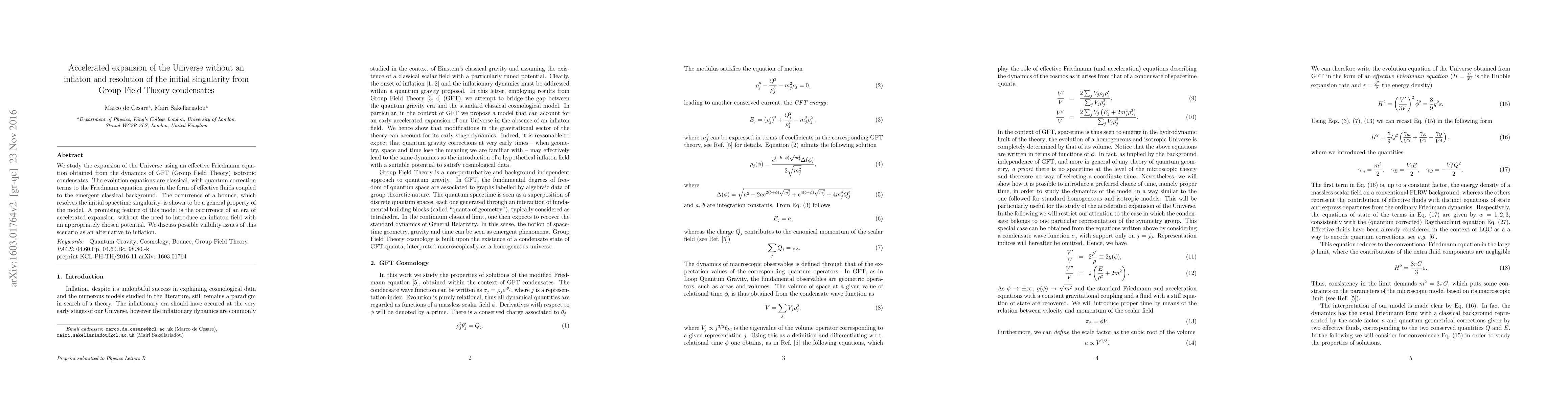 This research proposes an alternative to the inflaton field in explaining the accelerated expansion of the Universe, using Group Field Theory (GFT) condensates. The model resolves the initial singularity through a "bounce" and introduces an era of accelerated expansion without requiring an inflaton, suggesting potential viability as an alternative to traditional inflationary cosmology.