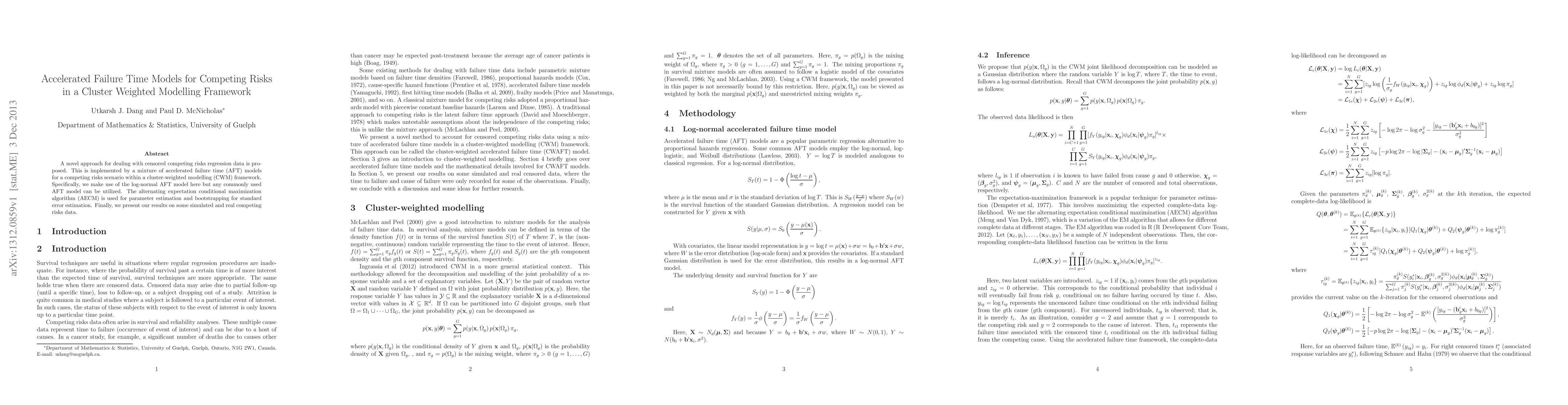 This paper proposes a novel mixture of accelerated failure time (AFT) models for censored competing risks data within a cluster-weighted modelling framework, utilizing the log-normal AFT model. The alternating expectation conditional maximization algorithm (AECM) is used for parameter estimation and bootstrapping for standard error estimation, with results demonstrated on both simulated and real data.