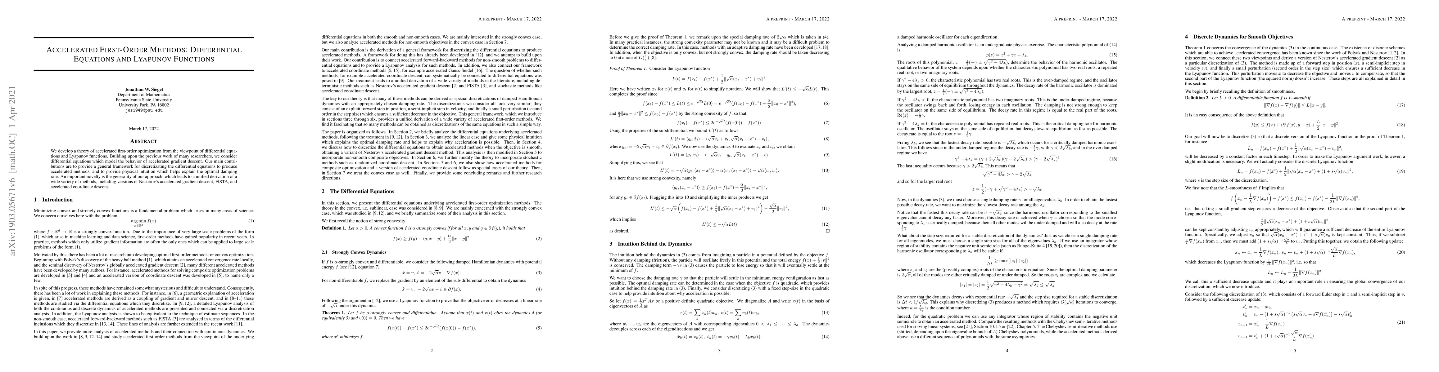 We develop a theory of accelerated first-order optimization from the viewpoint of differential equations and Lyapunov functions. Building upon the previous work of many researchers, we consider differential equations which model the behavior of accelerated gradient descent. Our main contributions are to provide a general framework for discretizating the differential equations to produce accelerated methods, and to provide physical intuition which helps explain the optimal damping rate. An important novelty is the generality of our approach, which leads to a unified derivation of a wide variety of methods, including versions of Nesterov's accelerated gradient descent, FISTA, and accelerated coordinate descent.