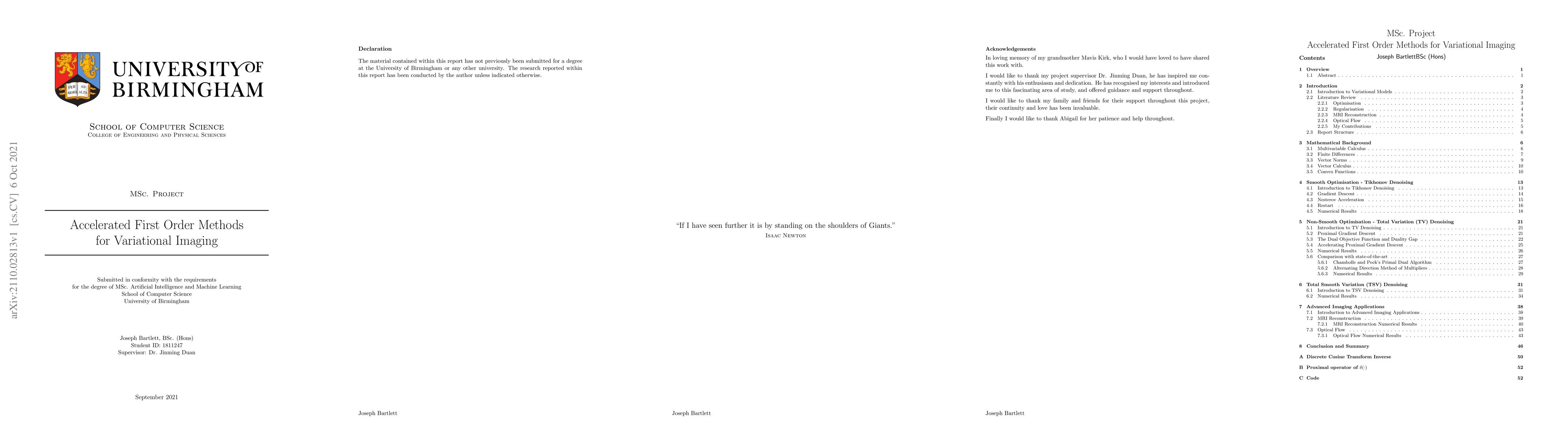 In this thesis, we offer a thorough investigation of different regularisation terms used in variational imaging problems, together with detailed optimisation processes of these problems. We begin by studying smooth problems and partially non-smooth problems in the form of Tikhonov denoising and Total Variation (TV) denoising, respectively. For Tikhonov denoising, we study an accelerated gradient method with adaptive restart, which shows a very rapid convergence rate. However, it is not straightforward to apply this fast algorithm to TV denoising, due to the non-smoothness of its built-in regularisation. To tackle this issue, we propose to utilise duality to convert such a non-smooth problem into a smooth one so that the accelerated gradient method with restart applies naturally. However, we notice that both Tikhonov and TV regularisations have drawbacks, in the form of blurred image edges and staircase artefacts, respectively. To overcome these drawbacks, we propose a novel adaption to Total Generalised Variation (TGV) regularisation called Total Smooth Variation (TSV), which retains edges and meanwhile does not produce results which contain staircase artefacts. To optimise TSV effectively, we then propose the Accelerated Proximal Gradient Algorithm (APGA) which also utilises adaptive restart techniques. Compared to existing state-of-the-art regularisations (e.g. TV), TSV is shown to obtain more effective results on denoising problems as well as advanced imaging applications such as magnetic resonance imaging (MRI) reconstruction and optical flow. TSV removes the staircase artefacts observed when using TV regularisation, but has the added advantage over TGV that it can be efficiently optimised using gradient based methods with Nesterov acceleration and adaptive restart. Code is available at https://github.com/Jbartlett6/Accelerated-First-Order-Method-for-Variational-Imaging.