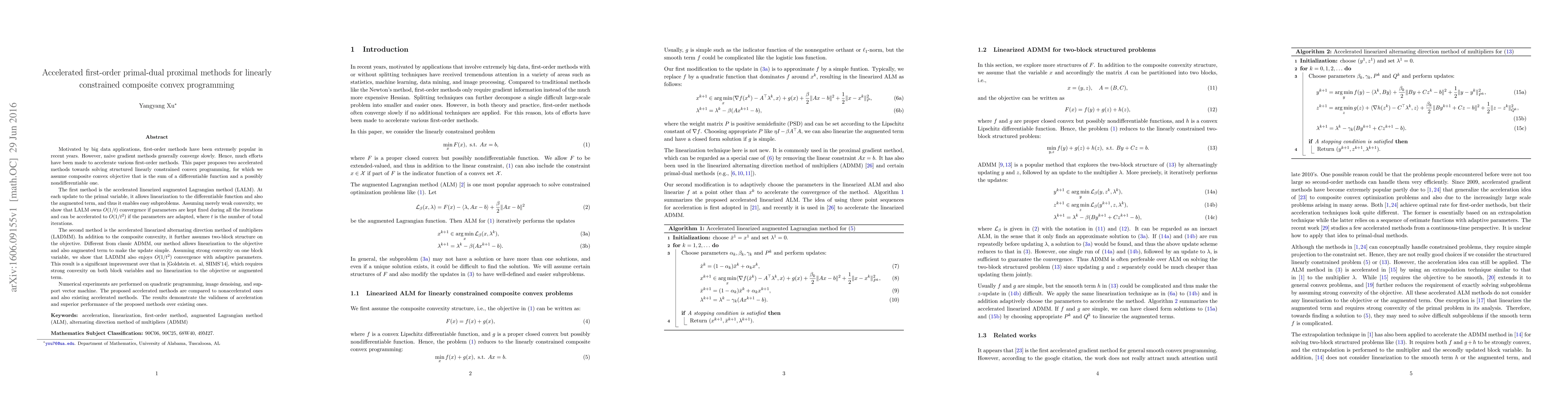 This paper proposes two accelerated first-order primal-dual methods for solving structured linearly constrained composite convex programming: the accelerated linearized augmented Lagrangian method (LALM) and the accelerated linearized alternating direction method of multipliers (LADMM). Both methods achieve $O(1/t^2)$ convergence with adaptive parameters, outperforming existing methods, as demonstrated through numerical experiments on quadratic programming, image denoising, and support vector machines.