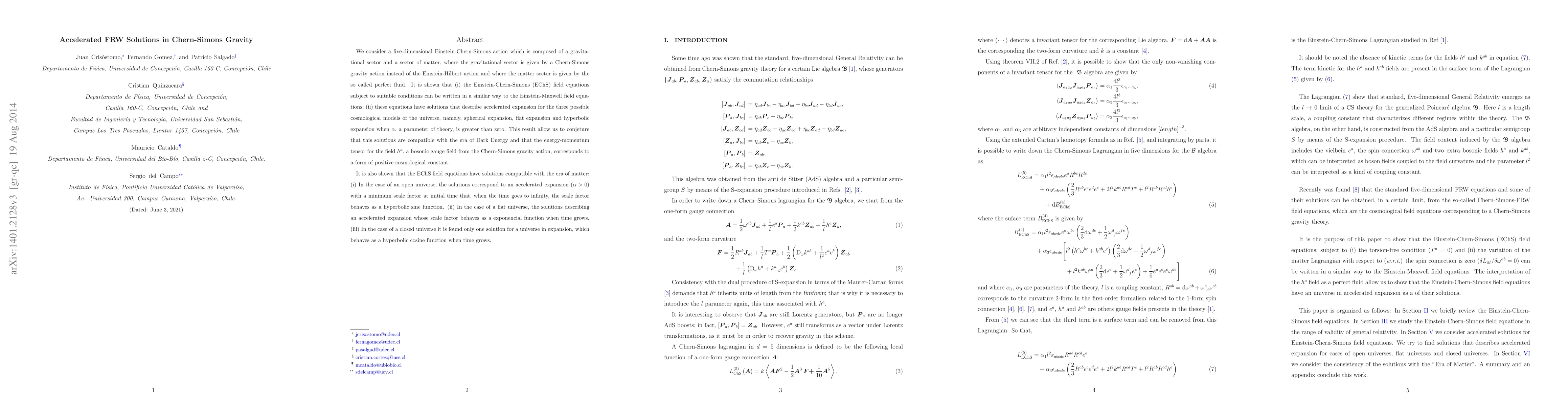 We consider a five-dimensional Einstein-Chern-Simons action which is composed of a gravitational sector and a sector of matter, where the gravitational sector is given by a Chern-Simons gravity action instead of the Einstein-Hilbert action and where the matter sector is given by the so called perfect fluid. It is shown that (i) the Einstein-Chern-Simons (EChS) field equations subject to suitable conditions can be written in a similar way to the Einstein-Maxwell field equations; (ii) these equations have solutions that describe accelerated expansion for the three possible cosmological models of the universe, namely, spherical expansion, flat expansion and hyperbolic expansion when $\alpha $, a parameter of theory, is greater than zero. This result allow us to conjeture that this solutions are compatible with the era of Dark Energy and that the energy-momentum tensor for the field $h^{a}$, a bosonic gauge field from the Chern-Simons gravity action, corresponds to a form of positive cosmological constant. It is also shown that the EChS field equations have solutions compatible with the era of matter: (i) In the case of an open universe, the solutions correspond to an accelerated expansion ($\alpha >0$) with a minimum scale factor at initial time that, when the time goes to infinity, the scale factor behaves as a hyperbolic sine function. (ii) In the case of a flat universe, the solutions describing an accelerated expansion whose scale factor behaves as a exponencial function when time grows. \item In the case of a closed universe it is found only one solution for a universe in expansion, which behaves as a hyperbolic cosine function when time grows.