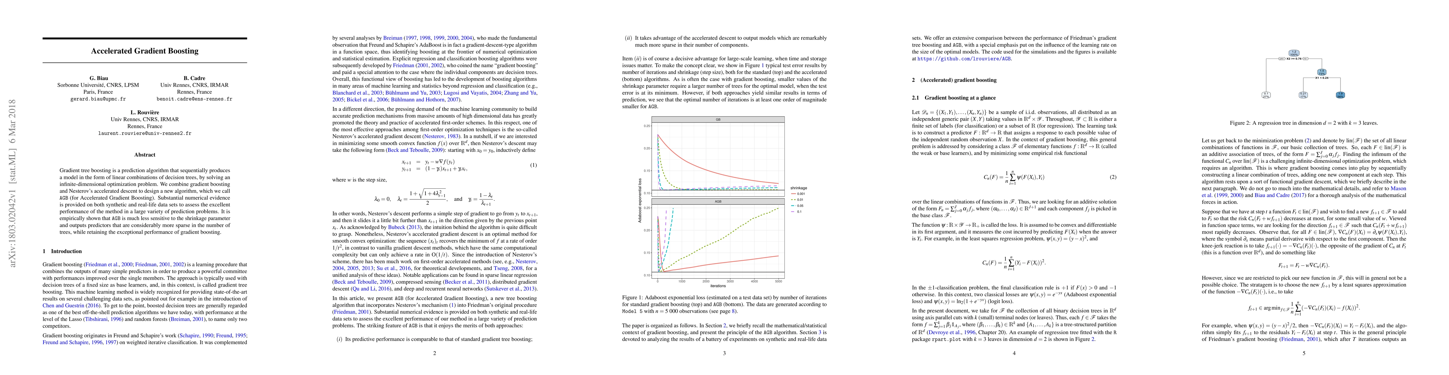 Accelerated Gradient Boosting (AGB) combines gradient boosting with Nesterov's accelerated descent, demonstrating superior performance across various prediction tasks. AGB exhibits reduced sensitivity to the shrinkage parameter and generates sparser models compared to traditional gradient boosting.