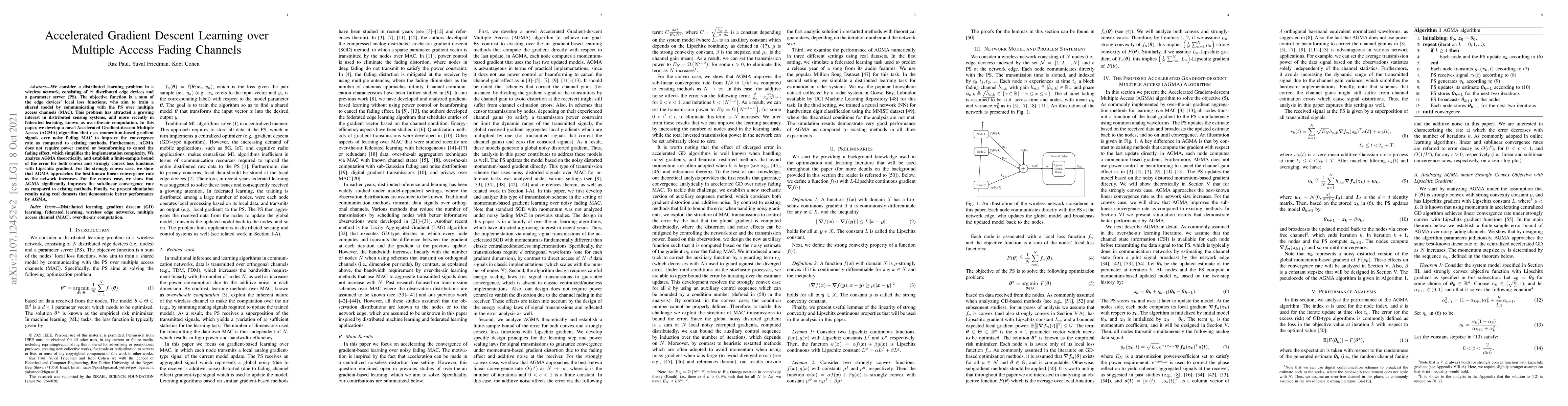 This paper introduces the Accelerated Gradient-descent Multiple Access (AGMA) algorithm for distributed learning in wireless networks, achieving faster convergence over fading channels without requiring power control. Theoretical analysis and simulations show improved performance for both convex and strongly convex loss functions.