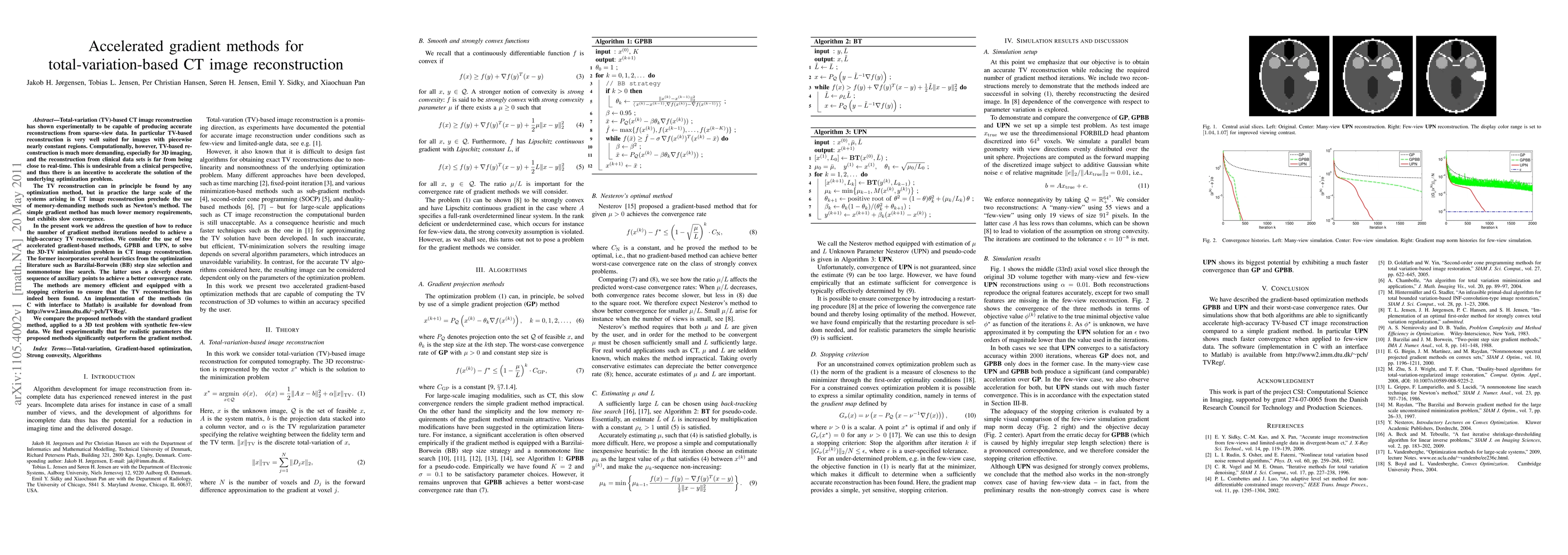 This paper proposes accelerated gradient methods, GPBB and UPN, to speed up total-variation-based CT image reconstruction, which is computationally demanding. The methods outperform the standard gradient method in terms of convergence speed while maintaining high reconstruction accuracy, making them suitable for real-time clinical applications.