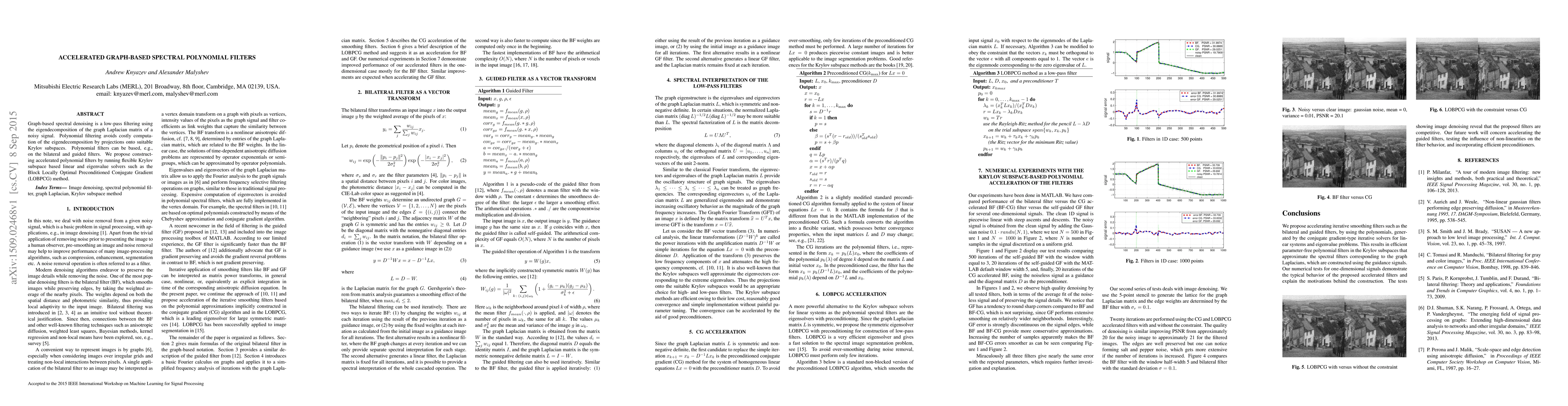 This paper proposes an accelerated graph-based spectral polynomial filter for denoising signals, utilizing Krylov subspace projections to avoid expensive eigendecomposition, and employing efficient solvers like LOBPCG for faster computation.
