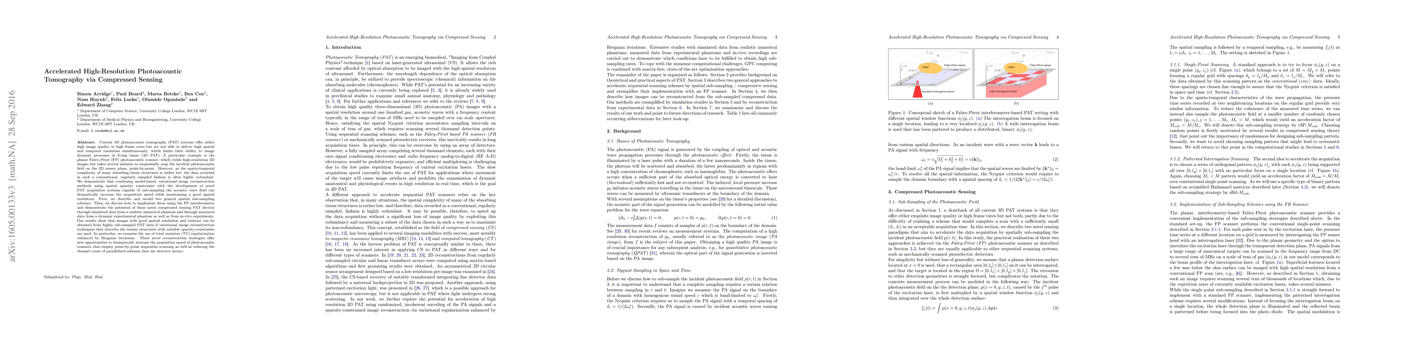 Current 3D photoacoustic tomography (PAT) systems offer either high image quality or high frame rates but are not able to deliver high spatial and temporal resolution simultaneously, which limits their ability to image dynamic processes in living tissue. A particular example is the planar Fabry-Perot (FP) scanner, which yields high-resolution images but takes several minutes to sequentially map the photoacoustic field on the sensor plane, point-by-point. However, as the spatio-temporal complexity of many absorbing tissue structures is rather low, the data recorded in such a conventional, regularly sampled fashion is often highly redundant. We demonstrate that combining variational image reconstruction methods using spatial sparsity constraints with the development of novel PAT acquisition systems capable of sub-sampling the acoustic wave field can dramatically increase the acquisition speed while maintaining a good spatial resolution: First, we describe and model two general spatial sub-sampling schemes. Then, we discuss how to implement them using the FP scanner and demonstrate the potential of these novel compressed sensing PAT devices through simulated data from a realistic numerical phantom and through measured data from a dynamic experimental phantom as well as from in-vivo experiments. Our results show that images with good spatial resolution and contrast can be obtained from highly sub-sampled PAT data if variational image reconstruction methods that describe the tissues structures with suitable sparsity-constraints are used. In particular, we examine the use of total variation regularization enhanced by Bregman iterations. These novel reconstruction strategies offer new opportunities to dramatically increase the acquisition speed of PAT scanners that employ point-by-point sequential scanning as well as reducing the channel count of parallelized schemes that use detector arrays.