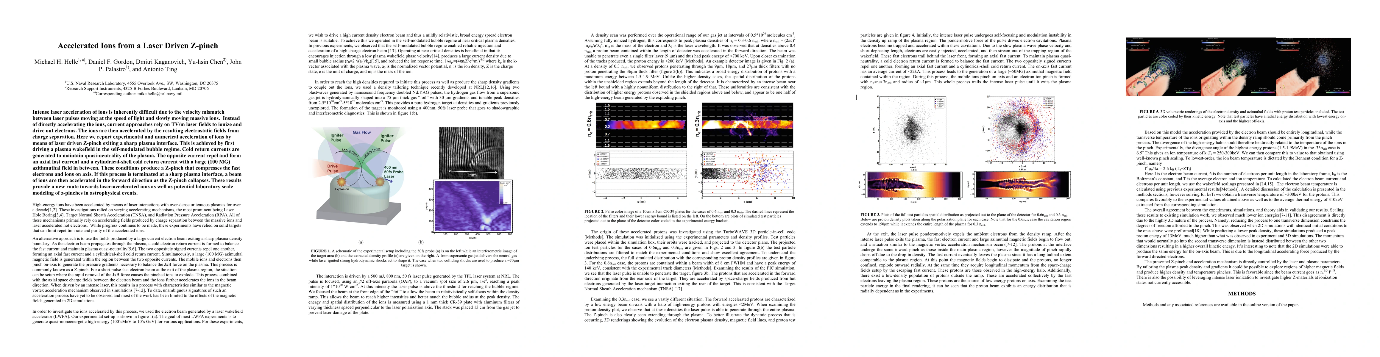 Intense laser acceleration of ions is inherently difficult due to the velocity mismatch between laser pulses moving at the speed of light and slowly moving massive ions. Instead of directly accelerating the ions, current approaches rely on TV/m laser fields to ionize and drive out electrons. The ions are then accelerated by the resulting electrostatic fields from charge separation. Here we report experimental and numerical acceleration of ions by means of laser driven Z-pinch exiting a sharp plasma interface. This is achieved by first driving a plasma wakefield in the self-modulated bubble regime. Cold return currents are generated to maintain quasi-neutrality of the plasma. The opposite current repel and form an axial fast current and a cylindrical-shell cold return current with a large (100 MG) azithmuthal field in between. These conditions produce a Z-pinch that compresses the fast electrons and ions on axis. If this process is terminated at a sharp plasma interface, a beam of ions are then accelerated in the forward direction as the Z-pinch collapses. These results provide a new route towards laser-accelerated ions as well as potential laboratory scale modeling of z-pinches in astrophysical events.