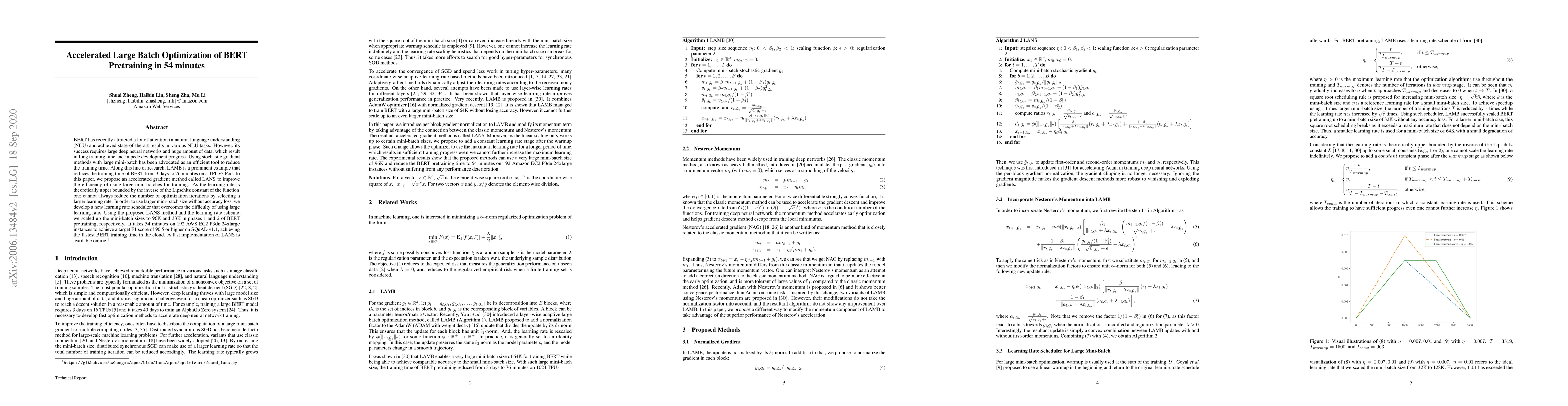 BERT has recently attracted a lot of attention in natural language understanding (NLU) and achieved state-of-the-art results in various NLU tasks. However, its success requires large deep neural networks and huge amount of data, which result in long training time and impede development progress. Using stochastic gradient methods with large mini-batch has been advocated as an efficient tool to reduce the training time. Along this line of research, LAMB is a prominent example that reduces the training time of BERT from 3 days to 76 minutes on a TPUv3 Pod. In this paper, we propose an accelerated gradient method called LANS to improve the efficiency of using large mini-batches for training. As the learning rate is theoretically upper bounded by the inverse of the Lipschitz constant of the function, one cannot always reduce the number of optimization iterations by selecting a larger learning rate. In order to use larger mini-batch size without accuracy loss, we develop a new learning rate scheduler that overcomes the difficulty of using large learning rate. Using the proposed LANS method and the learning rate scheme, we scaled up the mini-batch sizes to 96K and 33K in phases 1 and 2 of BERT pretraining, respectively. It takes 54 minutes on 192 AWS EC2 P3dn.24xlarge instances to achieve a target F1 score of 90.5 or higher on SQuAD v1.1, achieving the fastest BERT training time in the cloud.