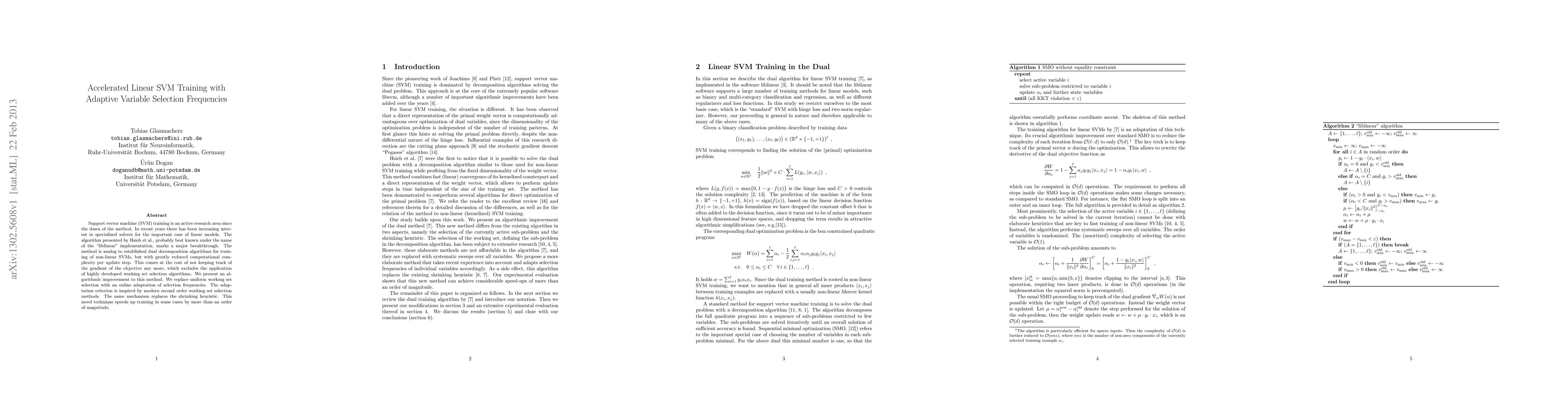 Support vector machine (SVM) training is an active research area since the dawn of the method. In recent years there has been increasing interest in specialized solvers for the important case of linear models. The algorithm presented by Hsieh et al., probably best known under the name of the "liblinear" implementation, marks a major breakthrough. The method is analog to established dual decomposition algorithms for training of non-linear SVMs, but with greatly reduced computational complexity per update step. This comes at the cost of not keeping track of the gradient of the objective any more, which excludes the application of highly developed working set selection algorithms. We present an algorithmic improvement to this method. We replace uniform working set selection with an online adaptation of selection frequencies. The adaptation criterion is inspired by modern second order working set selection methods. The same mechanism replaces the shrinking heuristic. This novel technique speeds up training in some cases by more than an order of magnitude.
