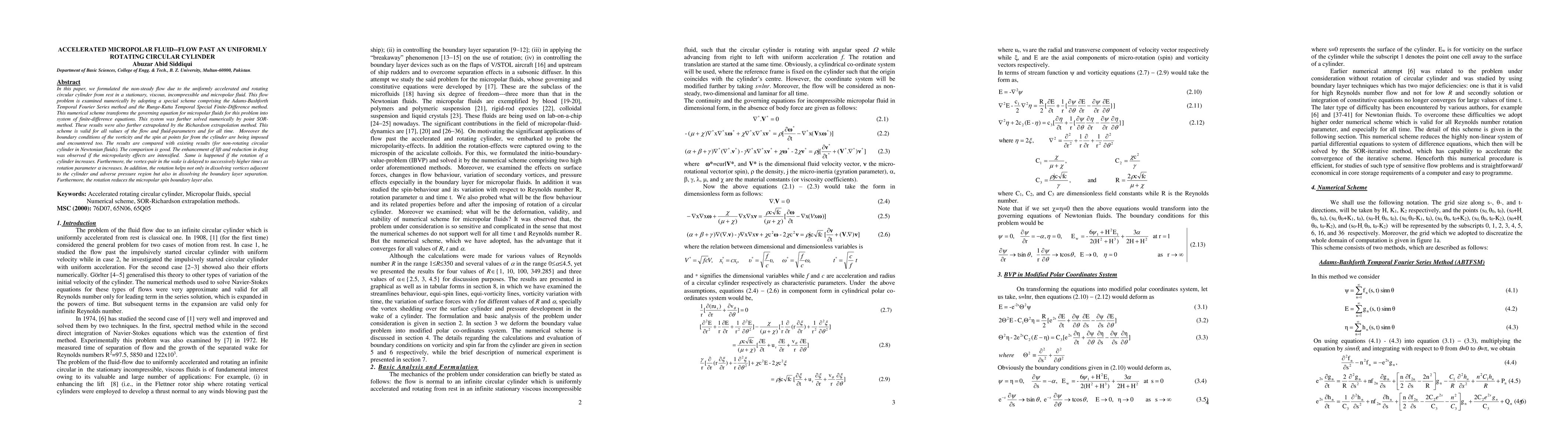 In this paper, we formulated the non-steady flow due to the uniformly accelerated and rotating circular cylinder from rest in a stationary, viscous, incompressible and micropolar fluid. This flow problem is examined numerically by adopting a special scheme comprising the Adams-Bashforth Temporal Fourier Series method and the Runge-Kutta Temporal Special Finite-Difference method. This numerical scheme transforms the governing equation for micropolar fluids for this problem into system of finite-difference equations. This system was further solved numerically by point SOR-method. These results were also further extrapolated by the Richardson extrapolation method. This scheme is valid for all values of the flow and fluid-parameters and for all time. Moreover the boundary conditions of the vorticity and the spin at points far from the cylinder are being imposed and encountered too. The results are compared with existing results (for non-rotating circular cylinder in Newtonian fluids). The comparison is good. The enhancement of lift and reduction in drag was observed if the micropolarity effects are intensified. Same is happened if the rotation of a cylinder increases. Furthermore, the vortex-pair in the wake is delayed to successively higher times as rotation parameter increases. In addition, the rotation helps not only in dissolving vortices adjacent to the cylinder and adverse pressure region but also in dissolving the boundary layer separation. Furthermore, the rotation reduces the micropolar spin boundary layer also.