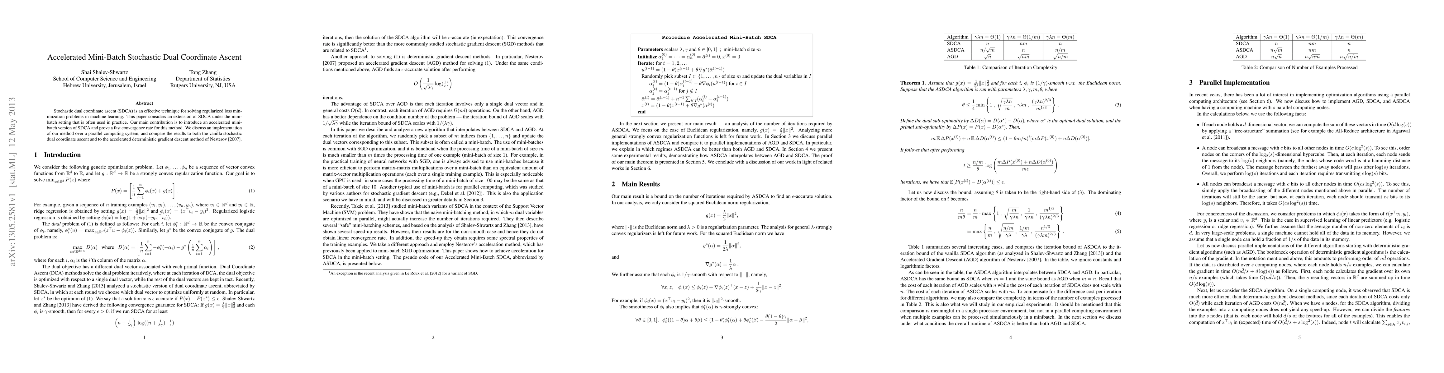 This paper introduces an accelerated mini-batch version of stochastic dual coordinate ascent (SDCA) for solving regularized loss minimization problems, proving faster convergence rates compared to traditional SDCA and accelerated gradient descent methods. The method is implemented on parallel computing systems and demonstrated to outperform both baseline methods.