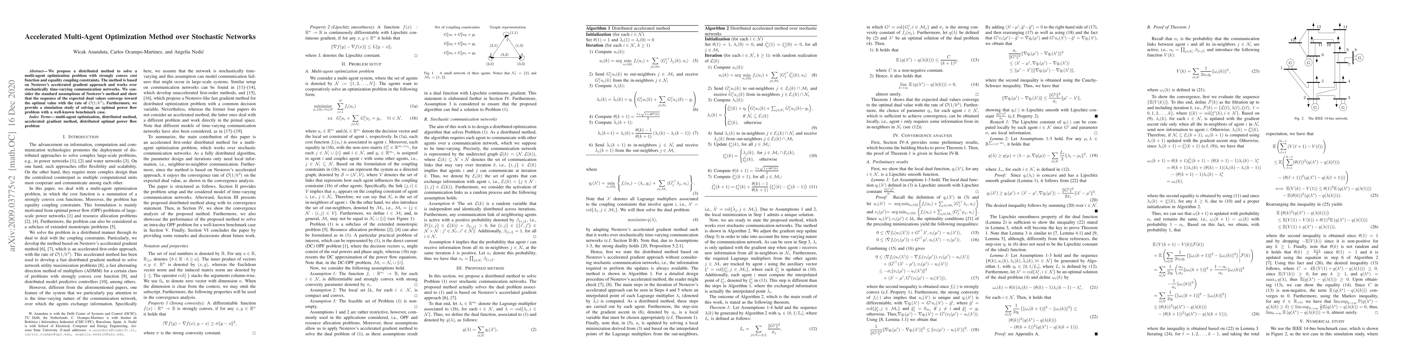 We propose a distributed method to solve a multi-agent optimization problem with strongly convex cost function and equality coupling constraints. The method is based on Nesterov's accelerated gradient approach and works over stochastically time-varying communication networks. We consider the standard assumptions of Nesterov's method and show that the sequence of the expected dual values converge toward the optimal value with the rate of $\mathcal{O}(1/k^2)$. Furthermore, we provide a simulation study of solving an optimal power flow problem with a well-known benchmark case.