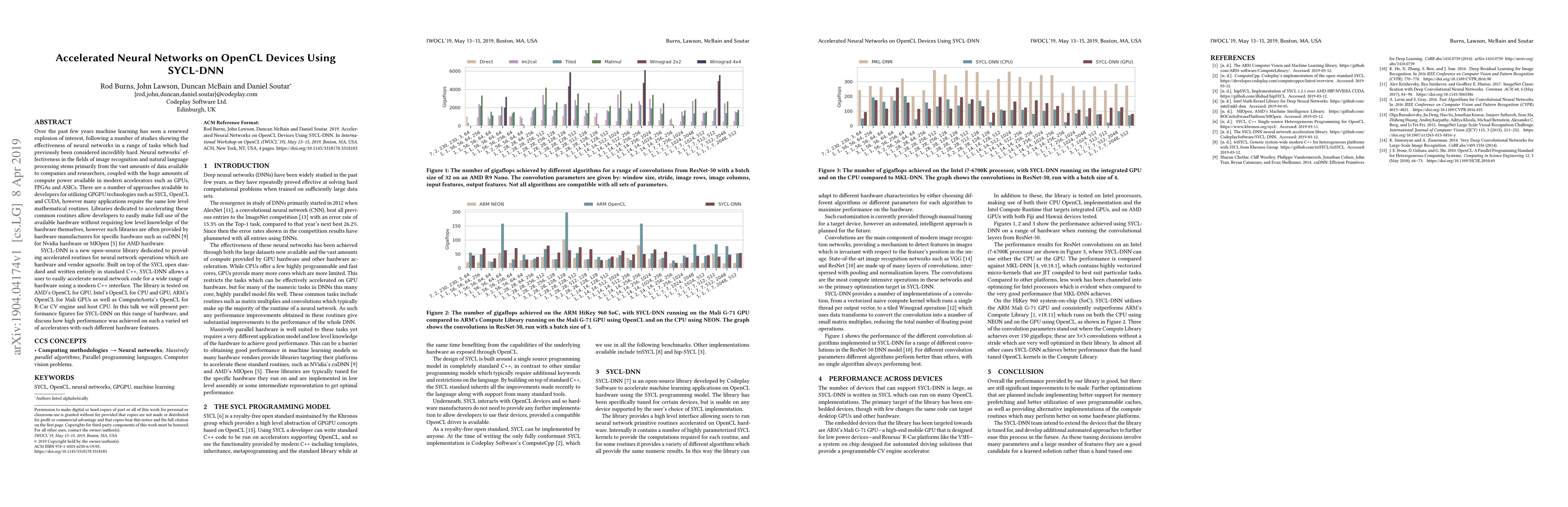 SYCL-DNN is an open-source library that provides accelerated neural network routines, built on the SYCL standard and tested on various hardware including GPUs, CPUs, and specialized engines. It aims to deliver high performance across diverse accelerators without requiring hardware-specific knowledge.